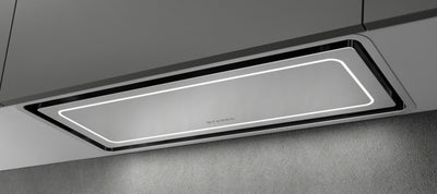 The perimeter extraction panel reduces the perceived sound by 25% (which is equal to a reduction of 3dB). This method of extraction guarantees optimised effectiveness by exploiting the principle of the Venturi effect: air accelerates as it passes through the constricted extraction space of the panel and decreases immediately inside the hood and is then easily expelled without the need for any particular pressure levels.