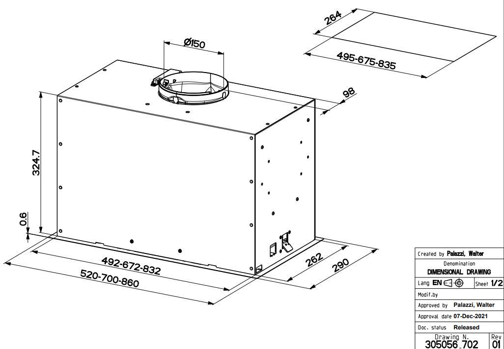 The perimeter extraction panel reduces the perceived sound by 25% (which is equal to a reduction of 3dB). This method of extraction guarantees optimised effectiveness by exploiting the principle of the Venturi effect: air accelerates as it passes through the constricted extraction space of the panel and decreases immediately inside the hood and is then easily expelled without the need for any particular pressure levels.