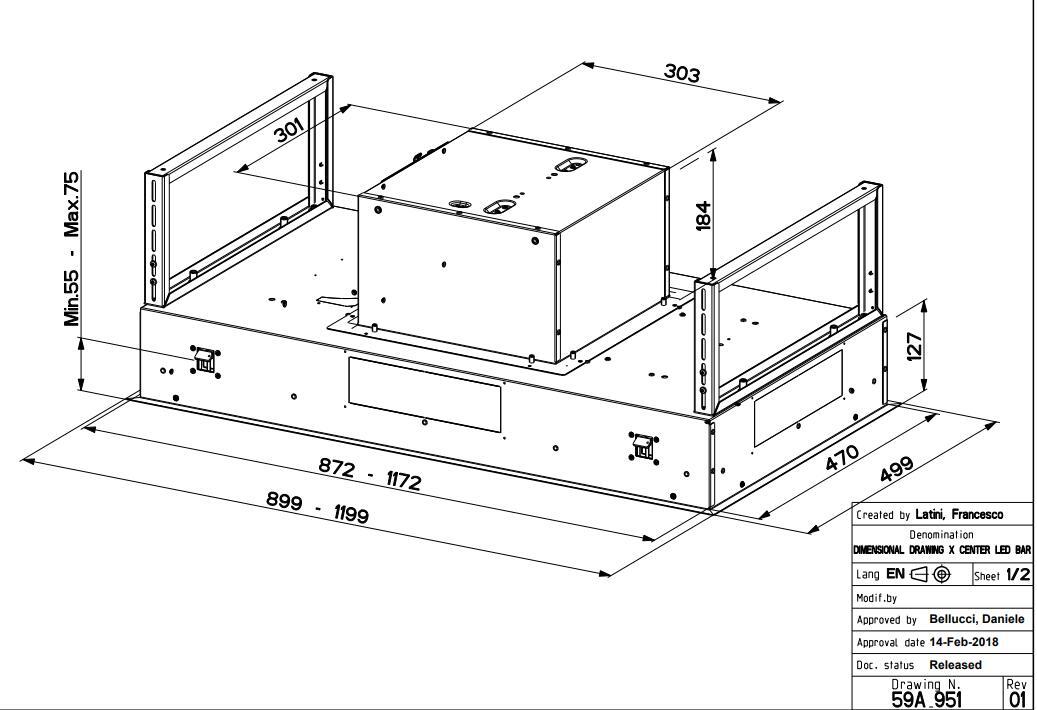 The perimeter extraction panel reduces the perceived sound by 25% (which is equal to a reduction of 3dB). This method of extraction guarantees optimised effectiveness by exploiting the principle of the Venturi effect: air accelerates as it passes through the constricted extraction space of the panel and decreases immediately inside the hood and is then easily expelled without the need for any particular pressure levels.