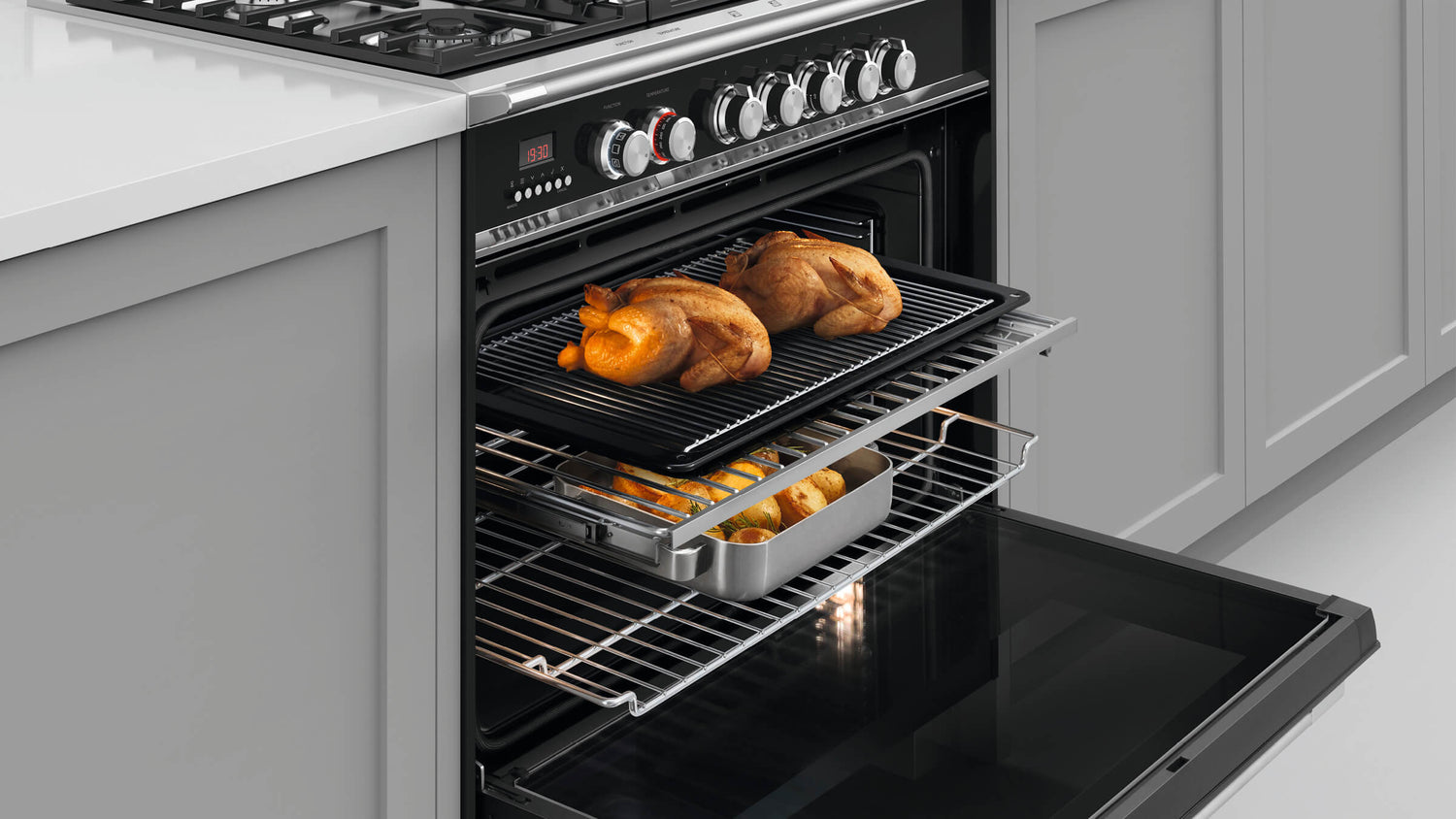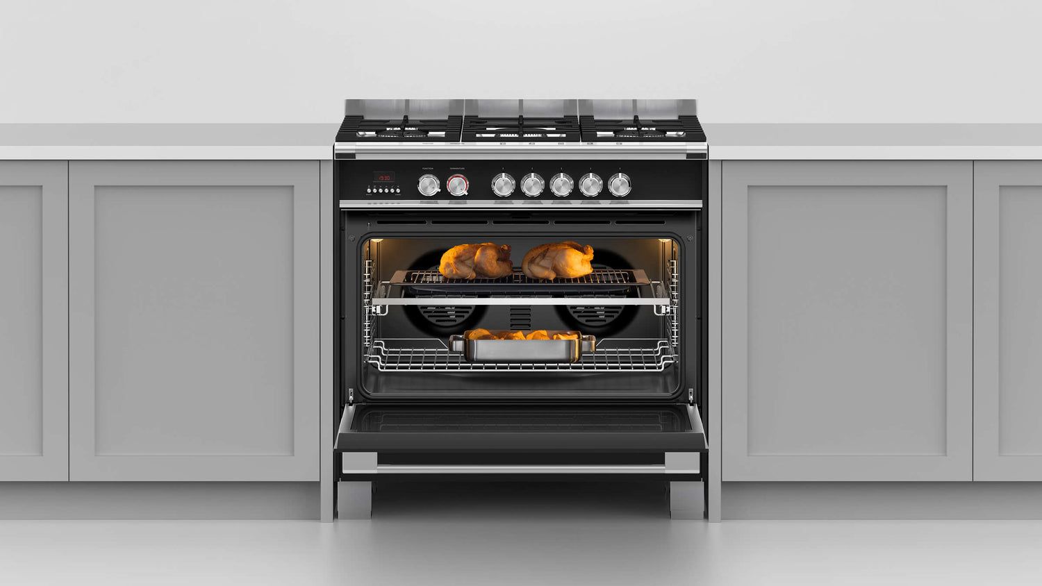 With a spacious gas cooktop and a large capacity convection oven, this Fisher & Paykel freestanding dual fuel cooker allows you to cook several dishes at once. The quadruple-glazed CoolTouch oven door allows safe touching of the oven door when the oven is on, perfect for families with small children. Nine oven functions, including a pizza mode, and highly responsive heat control of the hob, result in precise cooking.