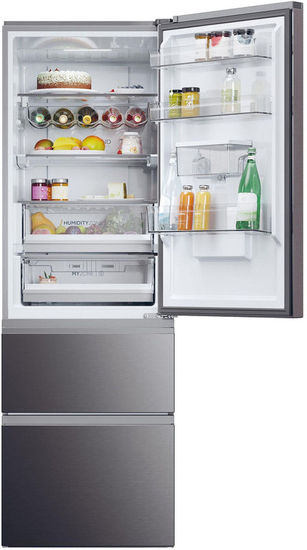 Experience ultimate convenience with the Haier HTW5618EWMP Fridge Freezer Frost Free in sophisticated Dark Inox. Boasting a generous 50/50 fridge-freezer storage ratio and a spacious interior, it offers ample room for all your groceries. With features like Auto Defrosting and Multi Air Flow Technology, maintenance is effortless. Enjoy the flexibility of My Zone Pro, allowing you to adjust temperature settings to suit your needs. Plus, the Super Cooling and Super Freezing functions ensure rapid chilling and freezing for maximum freshness. With its sleek design and intelligent features, this fridge freezer is a must-have for modern kitchens.