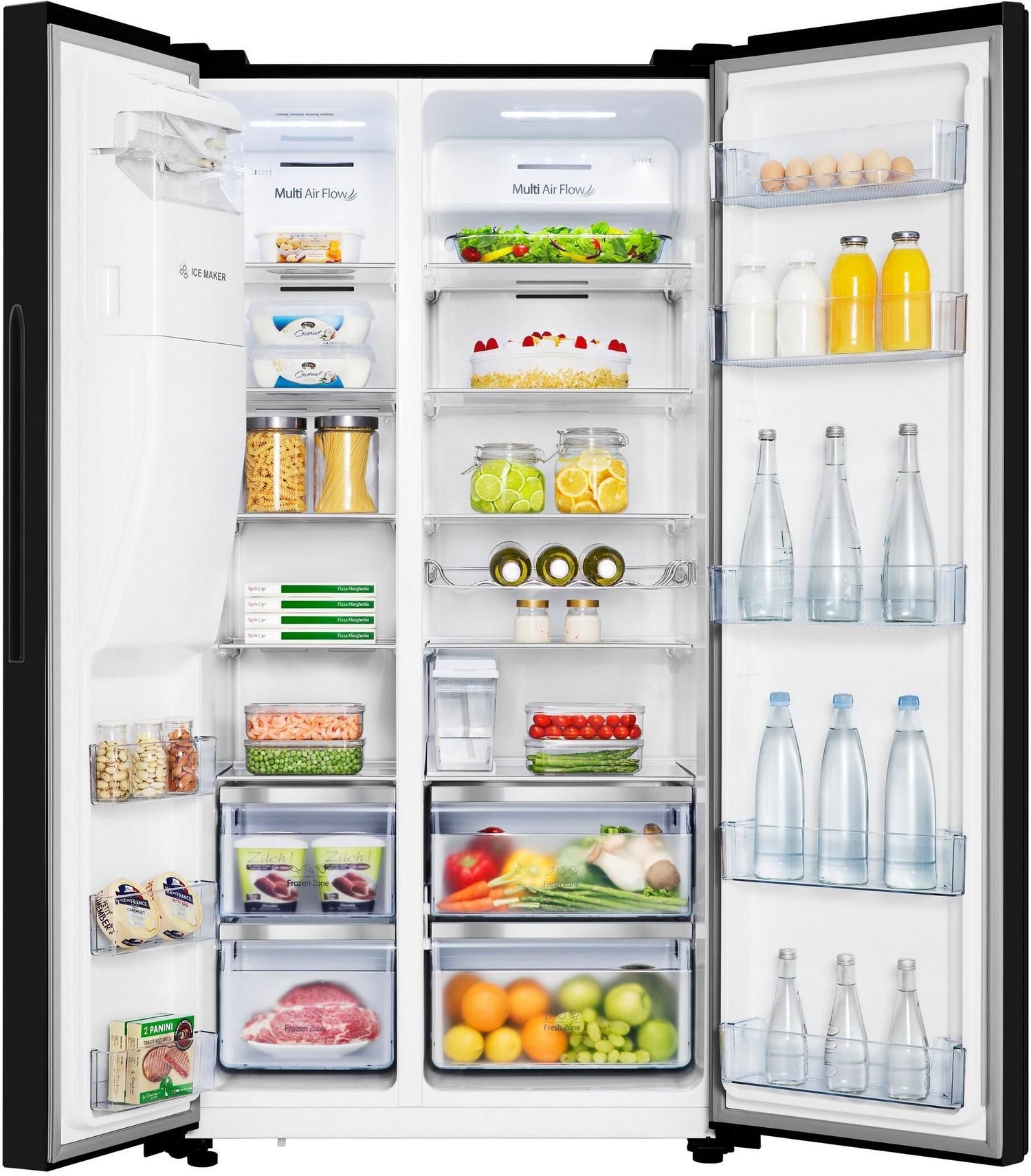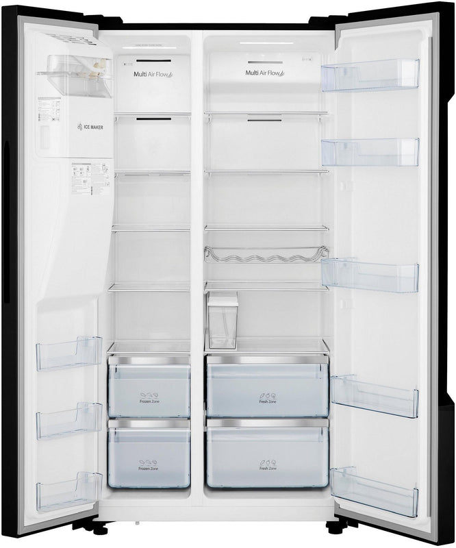 Discover the Hisense RS694N4TBE American-style fridge freezer, a stylish and efficient addition to your kitchen. With a generous 368L fridge capacity and 167L freezer capacity, it offers ample space for all your groceries. Enjoy the convenience of a non-plumbed water and ice dispenser for refreshing drinks. The appliance features 4 glass shelves, 2 salad bins, and 5 door balconies for flexible storage options. The black finish adds a sleek and modern touch to your kitchen decor.