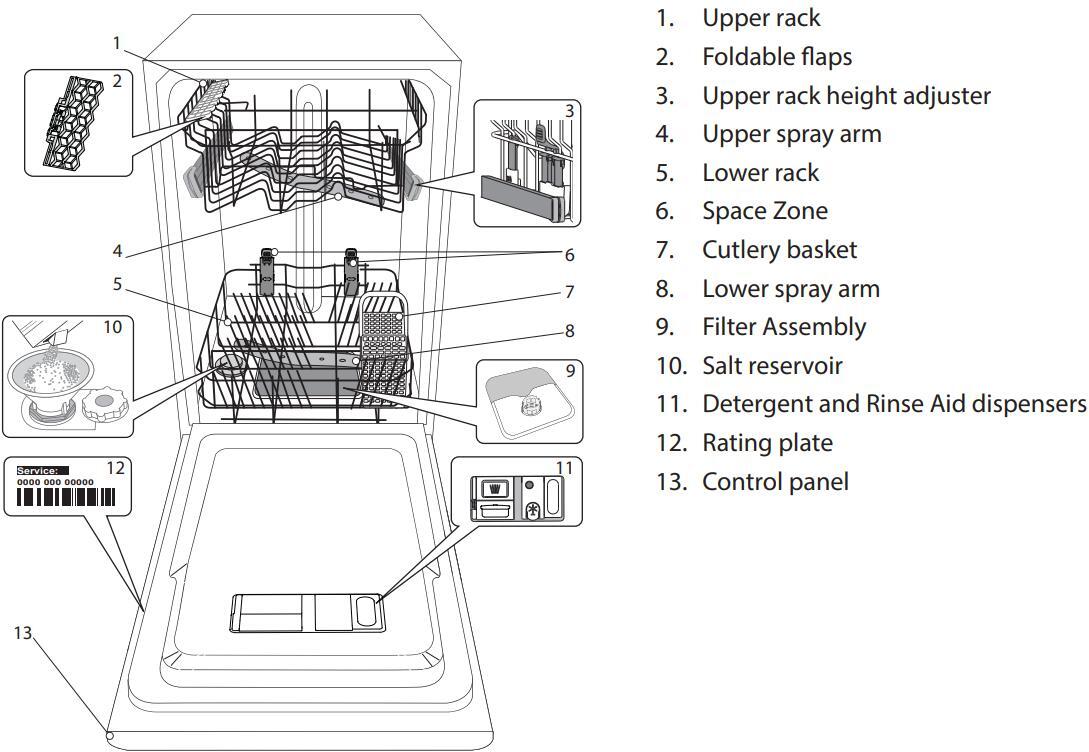 The user-friendly design features an adjustable upper basket and a cutlery basket, making it easy to load and unload dishes. The digital display and push-button controls on the top of the door are intuitive and simple to use. Additionally, the dishwasher includes a rinse aid light indicator, salt light indicator, and tablet indicator light for added convenience.