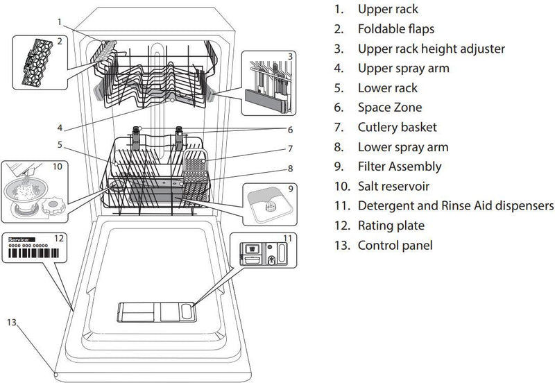 With features like the concealed heating element for effective drying and a counter balanced door for safety, the Hotpoint HSFCIH4798BI offers a blend of functionality, convenience, and performance. It's a perfect companion for anyone looking to ease their dishwashing chores while being mindful of their environmental footprint. With its array of features and efficient design, the Hotpoint HSFCIH4798BI is sure to be a valuable addition to any kitchen.