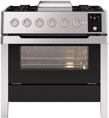 The Ilve Panoramagic range cooker features an impressive multi-function oven with 97 litre capacity and 15 cooking functions. In addition, there is a 6 gas burner hob with a removeable fry top, this features 3 sizes of brass burners each with cast iron pan supports. The cooker comes in a sleek stainless steel finish with modern LED-lit knobs and TFT oven touch controls resulting in a modern cooker that fits with any kitchen.