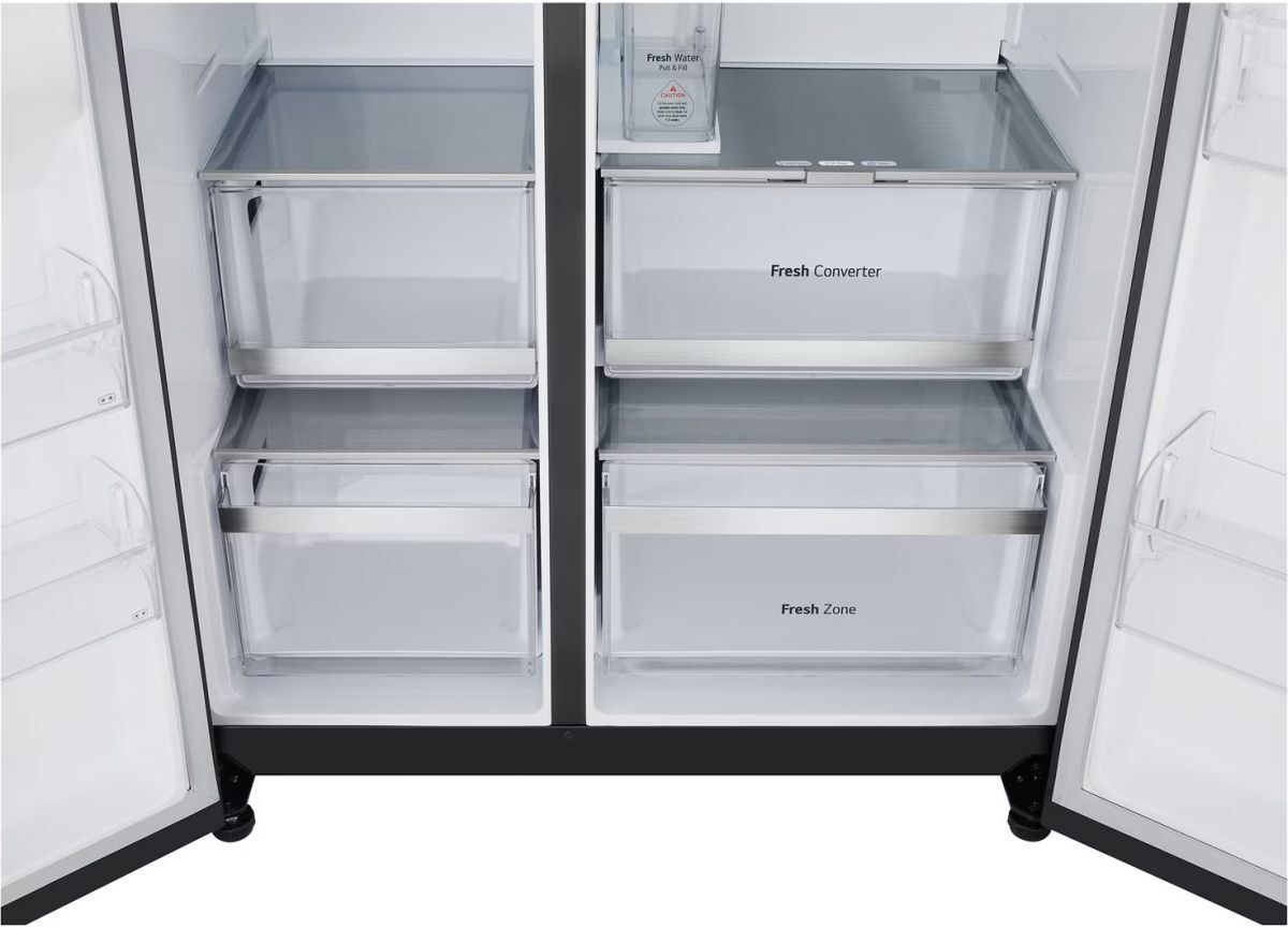 The GSLE81EPBD American Style Fridge Freezer from LG combines striking Essence Matte Black design with advanced cooling technology. Offering a generous 407L fridge and 221L freezer capacity, it features frost-free efficiency, DoorCooling+, Linear Cooling, and a Fresh Converter to keep food fresher for longer. The non-plumbed ice and water dispenser with UVnano nozzle ensures convenience and hygiene, while Wi-Fi connectivity via LG ThinQ adds smart control. With quiet operation at just 35 dB, sleek tempered glass shelving, and a stylish side-by-side arrangement, this freestanding appliance blends modern looks with reliable performance for everyday family living.
