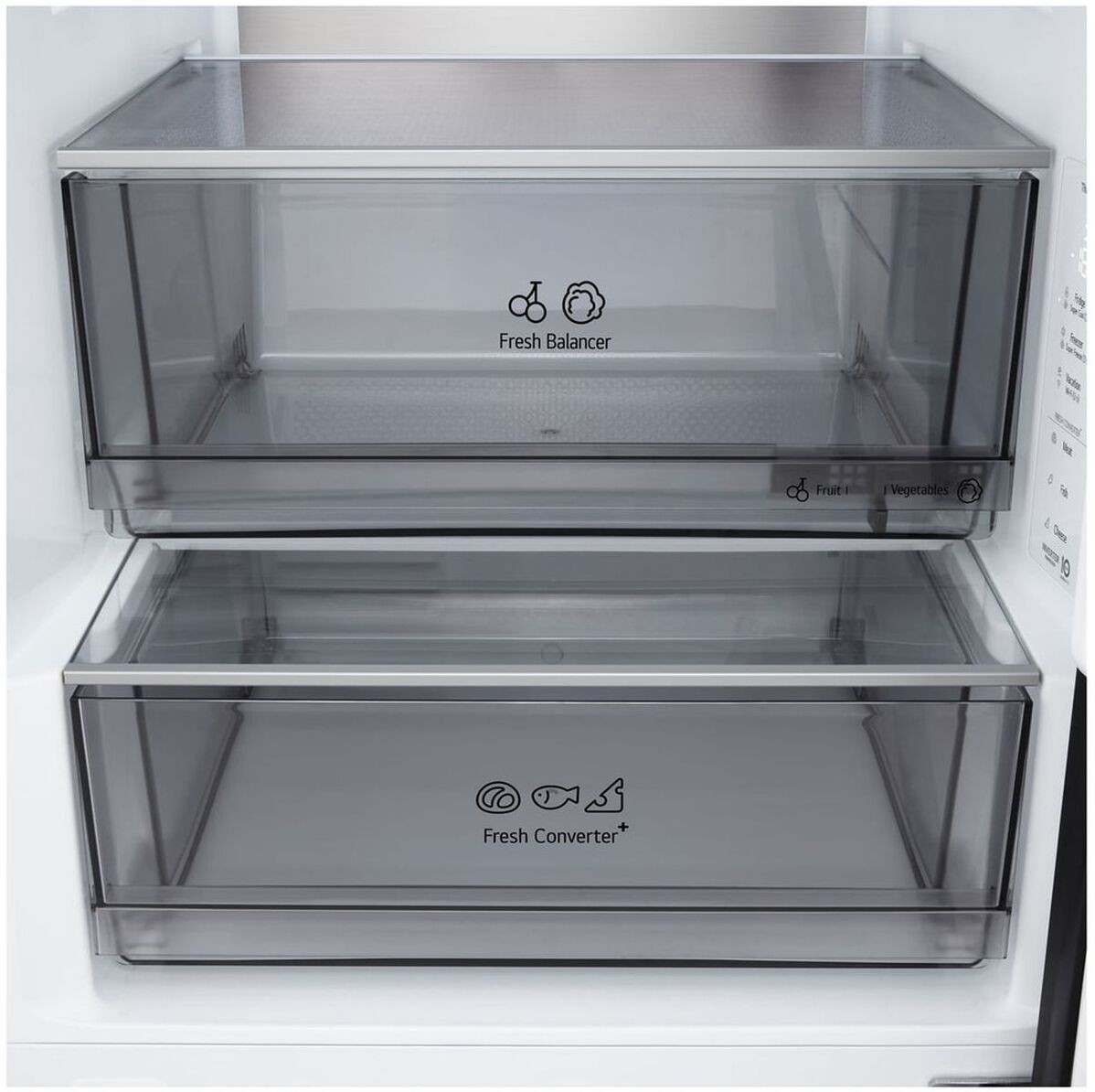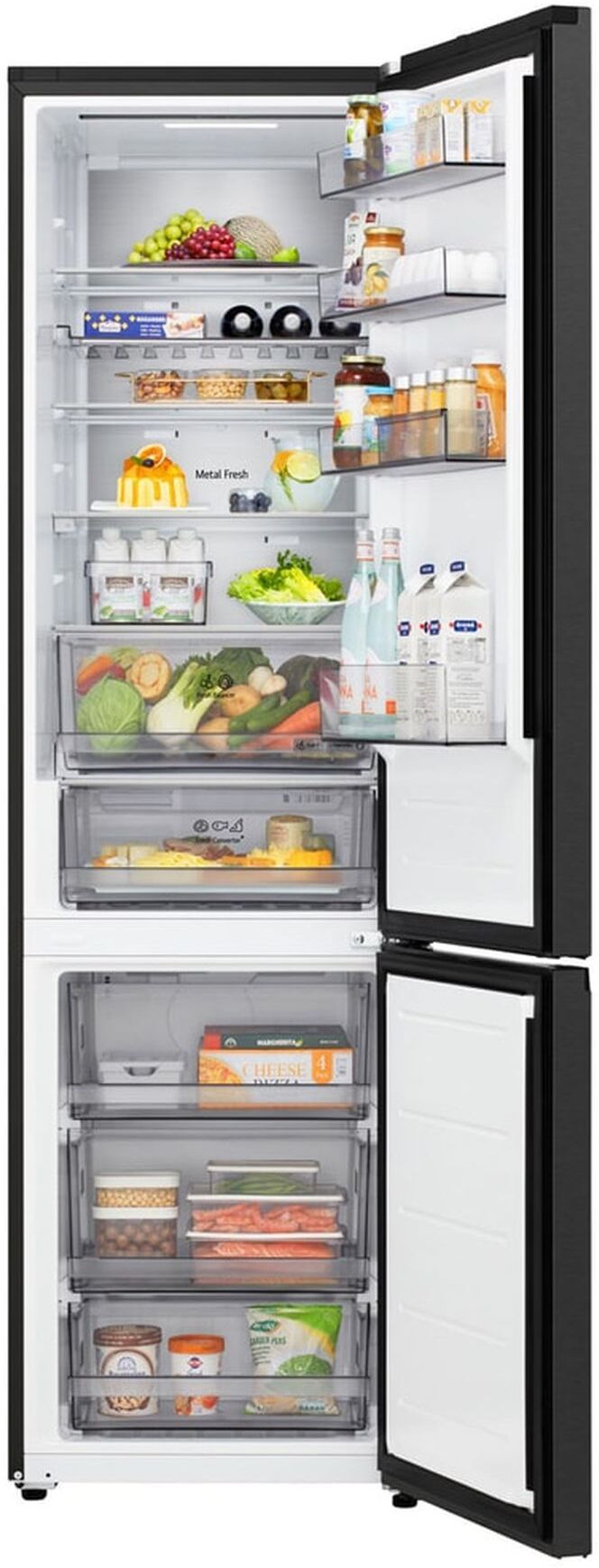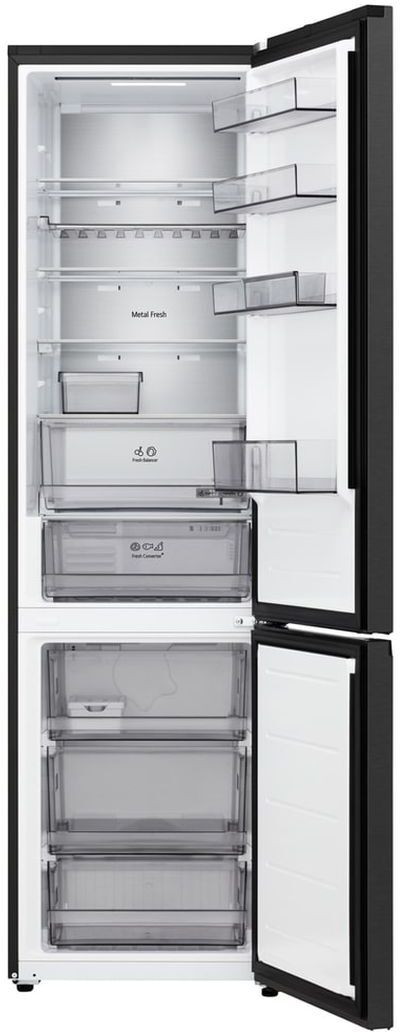 The LG GBBS524AEV fridge freezer delivers efficient, frost-free cooling with a spacious 262 L fridge and 113 L freezer. Its A-rated energy performance, ultra-quiet 29 dB operation and Smart Inverter Compressor keep running costs low. NatureFRESH technology with DoorCooling+ and LinearCooling helps maintain optimal freshness, while adjustable glass shelves, humidity control and a retractable shelf maximise storage. With Total No Frost, an open-door alert, Wi-Fi connectivity via ThinQ and a premium Essence Black Steel finish, it’s a stylish, reliable choice for busy homes.