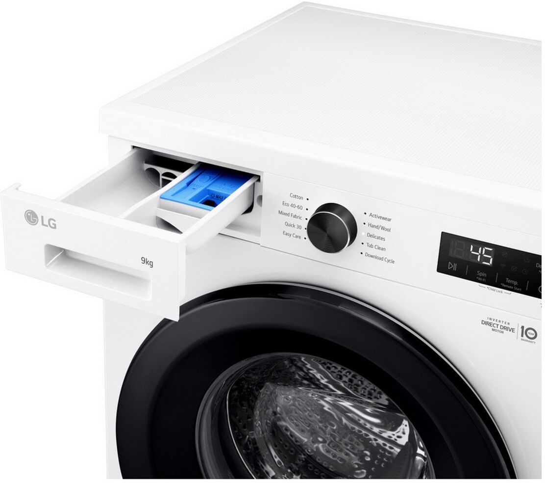 In terms of user control, the LG F4X1009NWK offers a combination of rotary dial and touch controls, with an LED display to keep you informed of cycle status and time remaining. The machine also includes practical features like a delay start option of up to 20 hours, which allows you to schedule your washing at a time that suits you, and an automatic load recognition system that adjusts water and energy use based on the size of the load, further enhancing its efficiency.