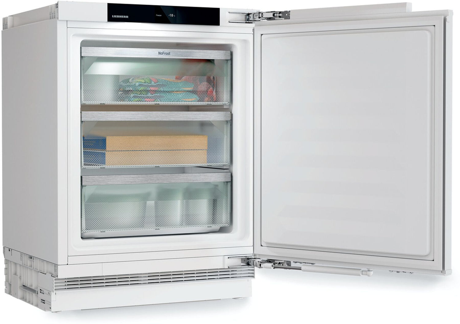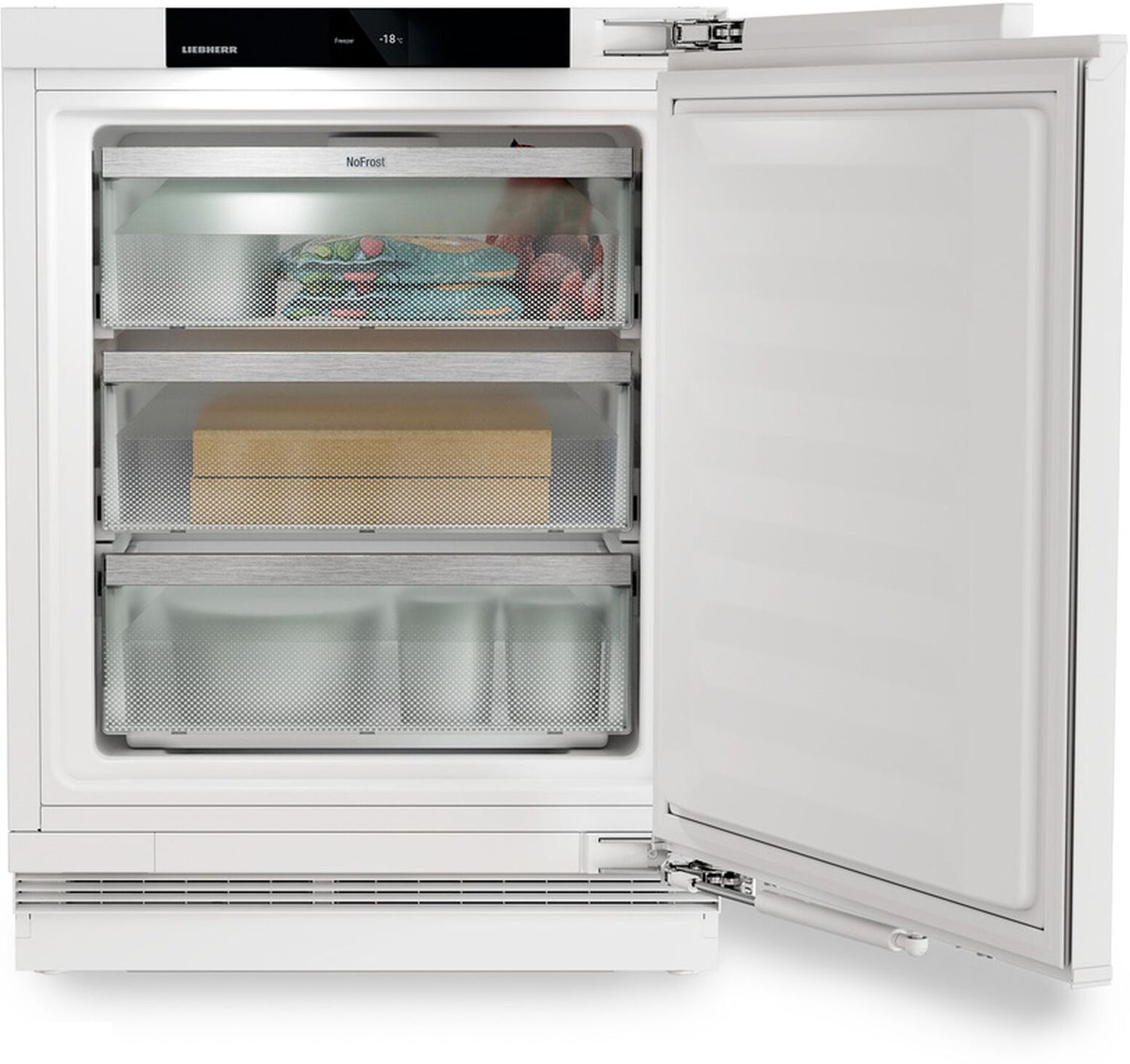 The Liebherr SUFND365I Prime Built-Under Frost Free Freezer offers premium freezing performance with a 74-litre net capacity and NoFrost technology, eliminating the need for manual defrosting. Featuring a sleek white finish, touch & swipe LCD controls, and a quiet 34 dB operation, it seamlessly integrates into your kitchen. The freezer includes three spacious drawers with VarioSpace for flexible storage, an audible open door alert, and a power failure alarm for added security. With an energy efficiency rating of D and SmartDeviceBox integration, the SUFND365I combines convenience, efficiency, and modern design in a compact built-under unit.