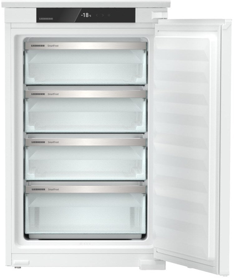 The Liebherr IFSD3904 upright freezer is a sophisticated, fully integrated low frost model. With a net freezer volume of 101L and a SmartFrost freezer type, it offers efficient cooling with minimal frost build-up. Key features include energy efficiency rating D, super-silent operation at 33 dB, and internet connectivity (smart device box purchased separately). It has four draws, a sliding hinge right-hand door, and a range of modes such as SabbathMode and PartyMode. Its touch LCD display provides effortless control, and the reversible door allows flexible installation, making it a versatile addition to any modern kitchen.