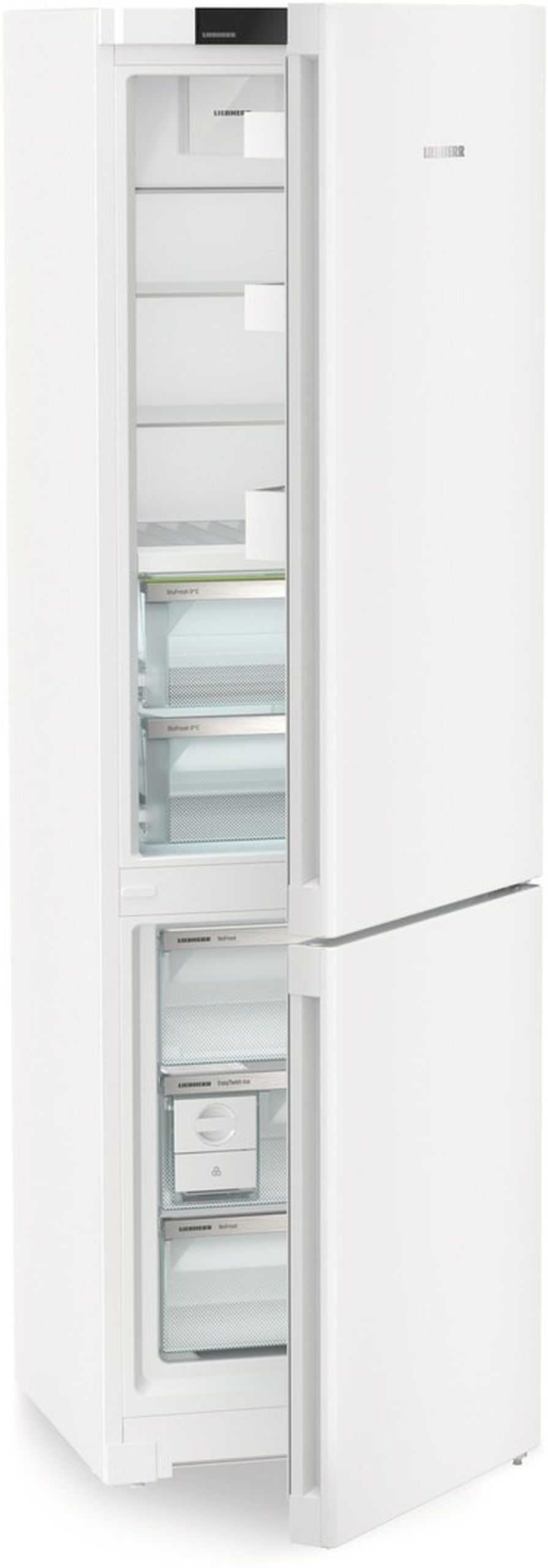 The Liebherr Plus CBNA572I Freestanding 70/30 NoFrost fridge freezer, distinguished by its sleek white finish and A energy rating, offers optimal freshness with advanced BioFresh technology. It features a sophisticated touch display for intuitive control over the DualCooling and NoFrost systems, which maintain separate climates in the fridge and freezer, preventing frost buildup and keeping produce fresher. With a spacious 360-litre capacity, including BioFresh safes, it integrates seamlessly into any kitchen setting. Additional functionalities like SuperCool, SuperFrost, and a practical EasyTwist-Ice system enhance everyday convenience and efficiency.