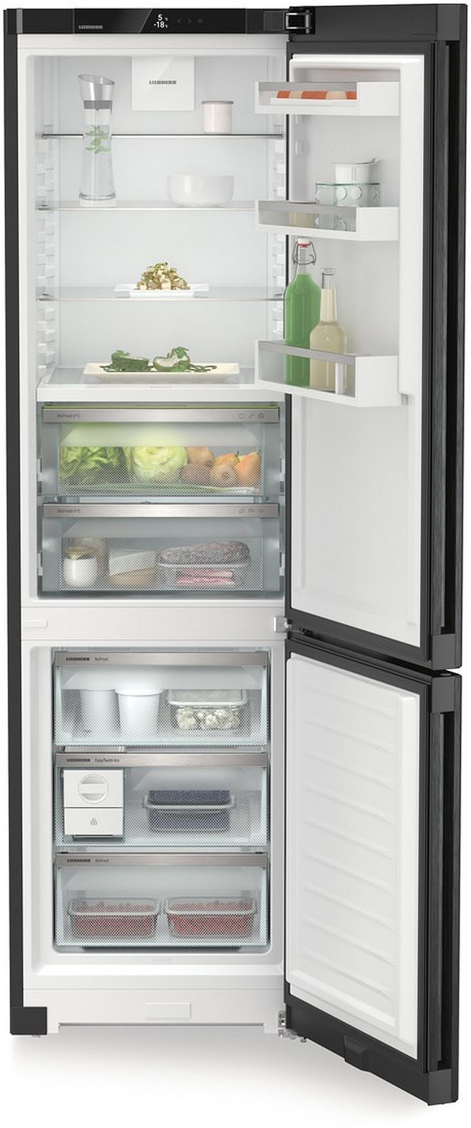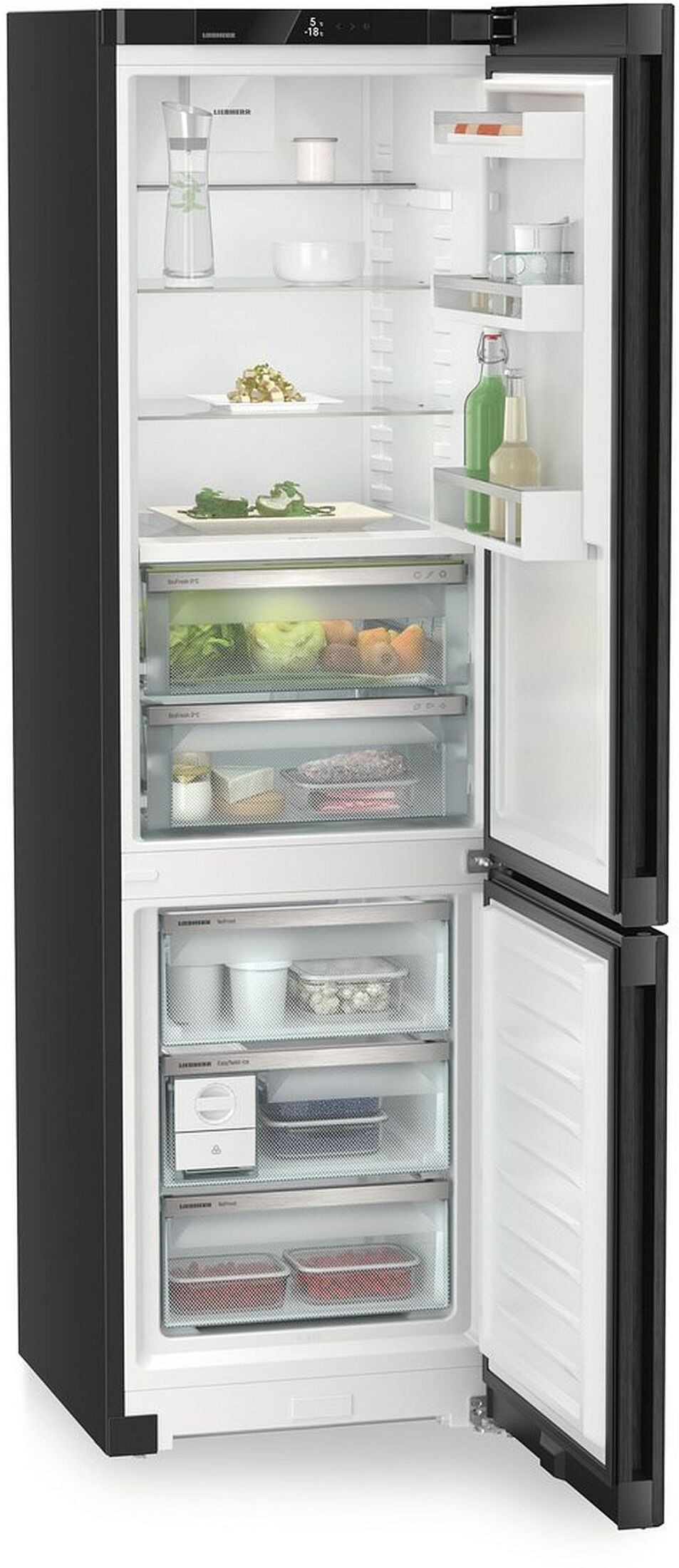 The Liebherr Plus CBNBDA572I Freestanding 70/30 Fridge Freezer combines sleek design with cutting-edge technology. Boasting an A energy rating, this appliance features BioFresh and NoFrost systems to keep your groceries fresher longer while ensuring frost-free operation. With a total capacity of 360 litres, including a 258-litre refrigerator and a 103-litre freezer, it offers ample storage. The unit is controlled via a touch display with adjustable settings for optimal convenience. Finished in elegant black steel with energy-efficient LED lighting, it adds a modern touch to any kitchen, ensuring both functionality and style.