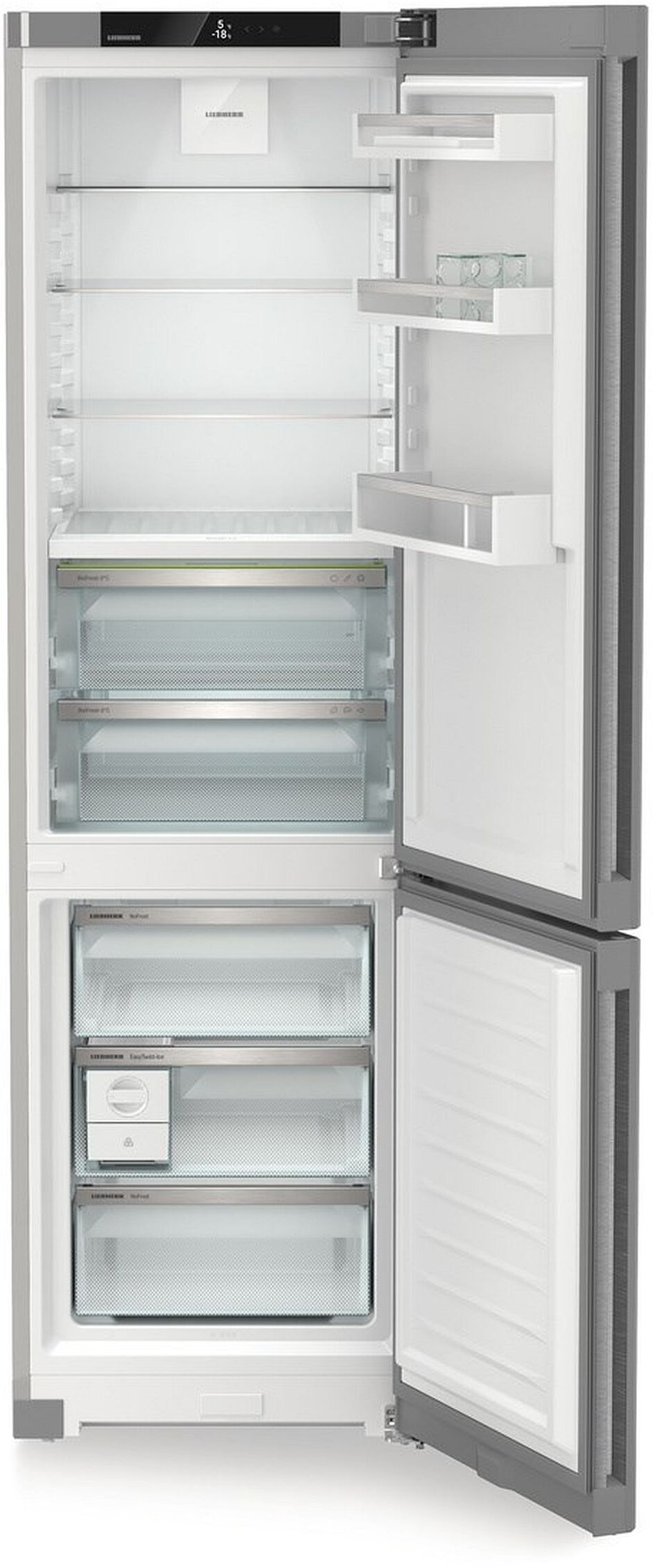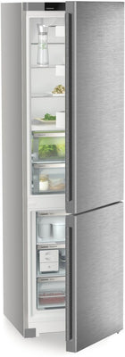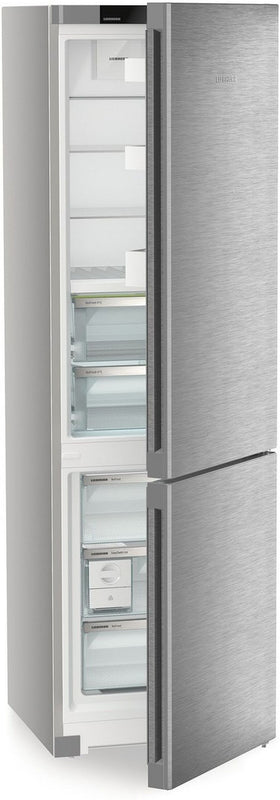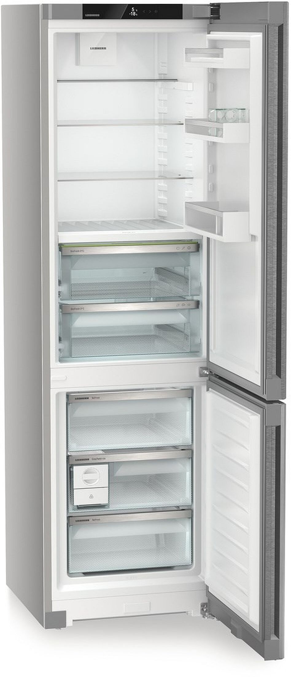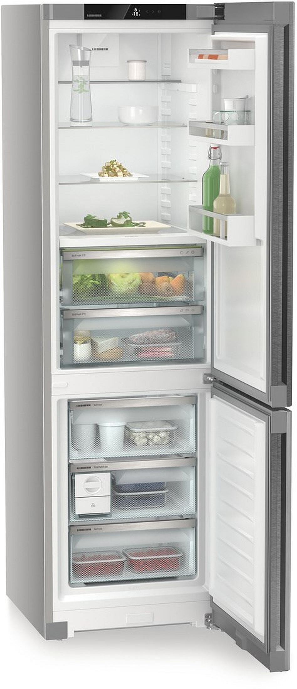 The Liebherr CBNSDA572I Plus 60cm Wide Biofresh Frost Free Fridge Freezer, with stainless steel doors, offers 258L fridge and 103L freezer capacities. Its advanced BioFresh technology keeps food fresher for longer, while DuoCooling ensures optimal temperature control. With an A energy rating, it operates efficiently and quietly at 34 dB. Features include adjustable glass shelves, humidity control, and a visual and audible door alarm. Convenient touch controls, an LCD display, and SuperSilent operation enhance user experience. Ideal for modern kitchens, it combines style and functionality with its freestanding design and reversible door.