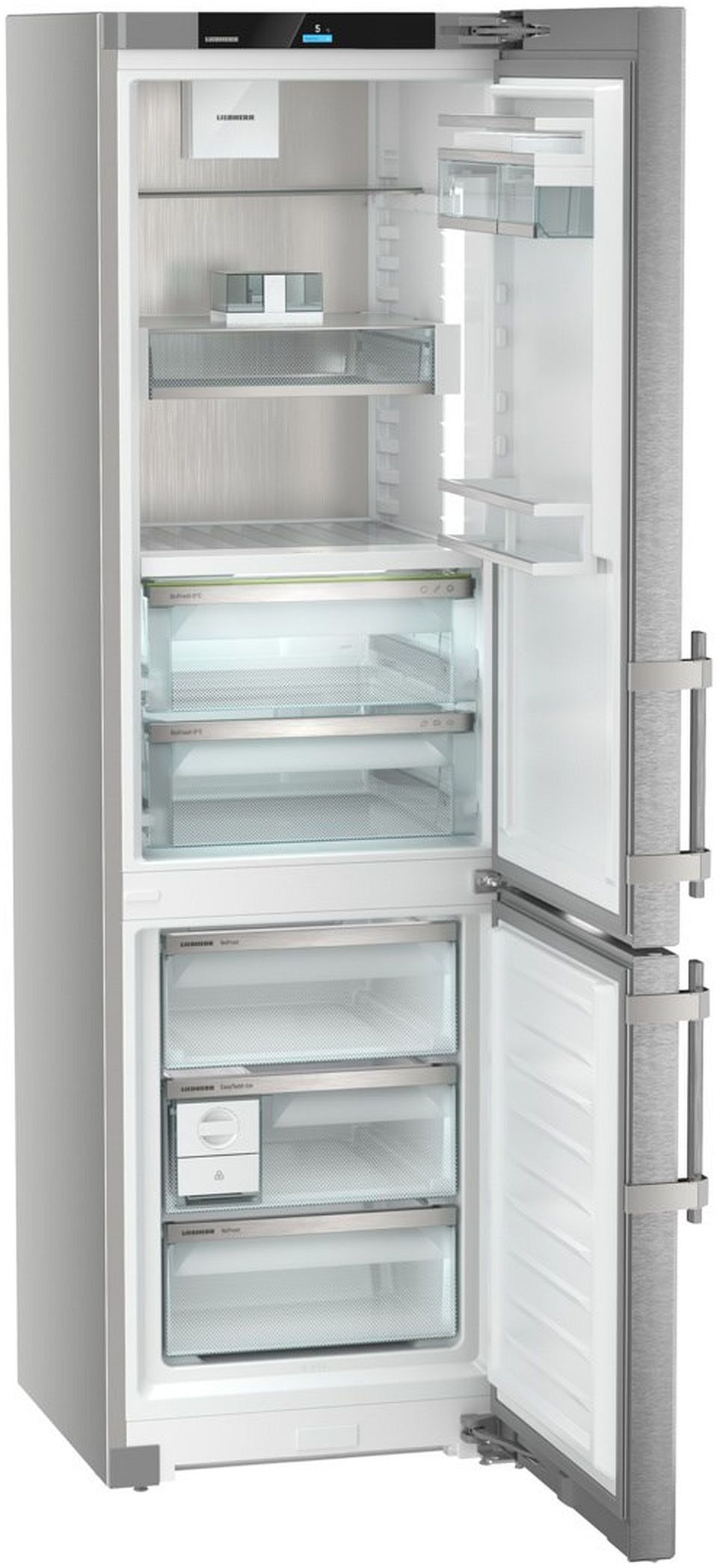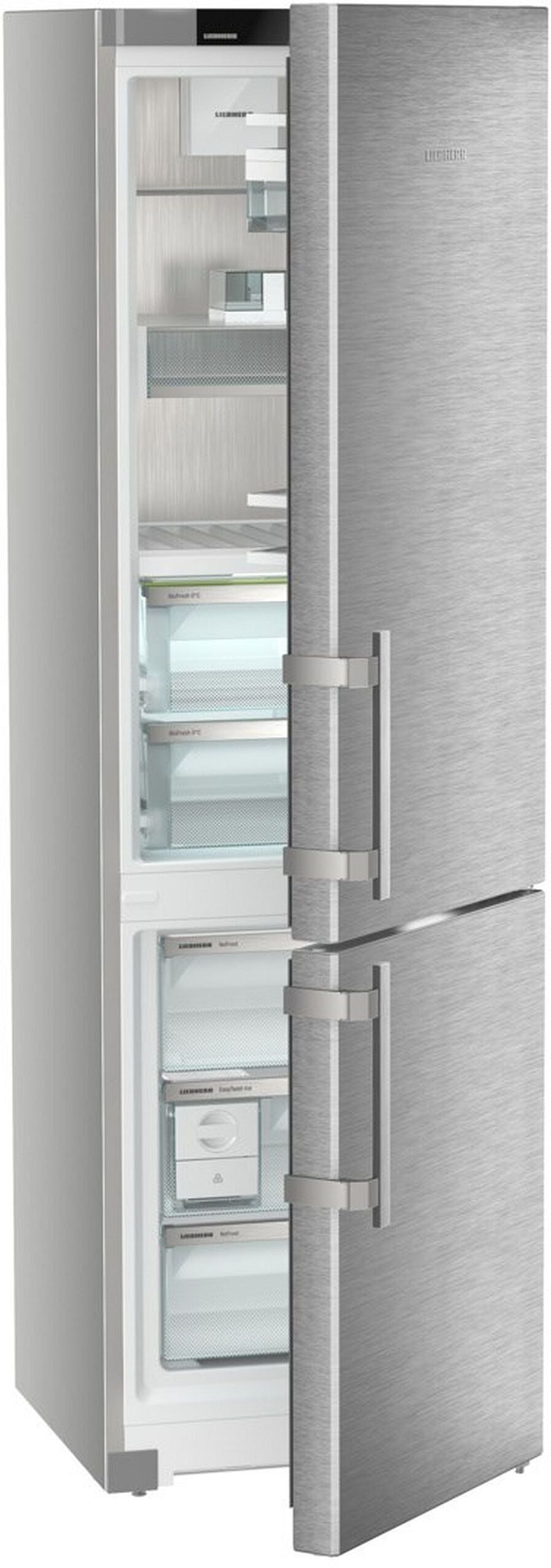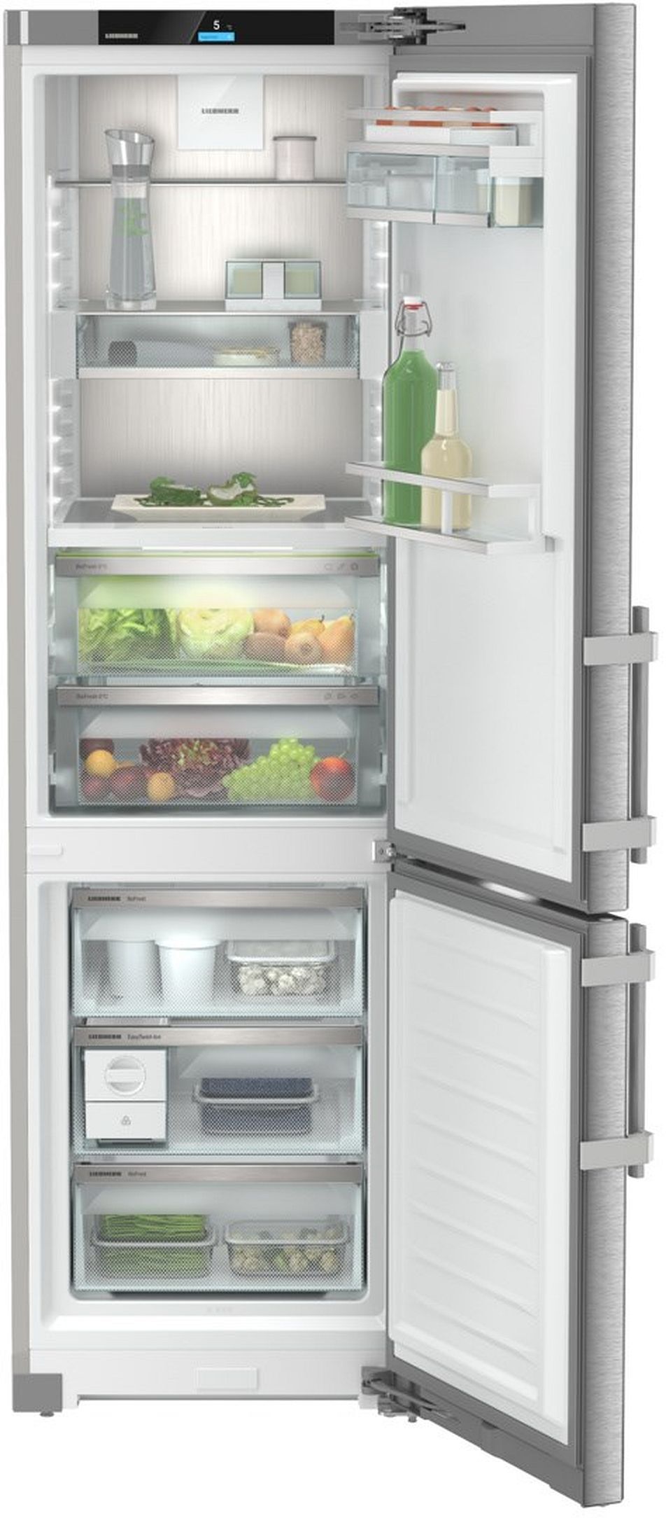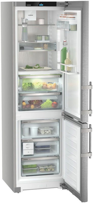 Introducing the Liebherr Prime CBNSDA575I, a freestanding fridge freezer that seamlessly combines sophisticated design with cutting-edge technology. Featuring stainless steel doors and an Energy Efficiency Class A rating, this model ensures low energy consumption of just 116 kWh per year while operating quietly at 33 dB. The NoFrost system prevents ice build-up in the freezer, and BioFresh technology maintains optimal humidity levels to keep your produce fresher longer. With a 2.4” TFT Touch & Swipe display, it offers easy control over settings such as SuperCool and SuperFrost, which can be adjusted both on the appliance and via an app, making it a prime choice for modern kitchens seeking efficiency and style.