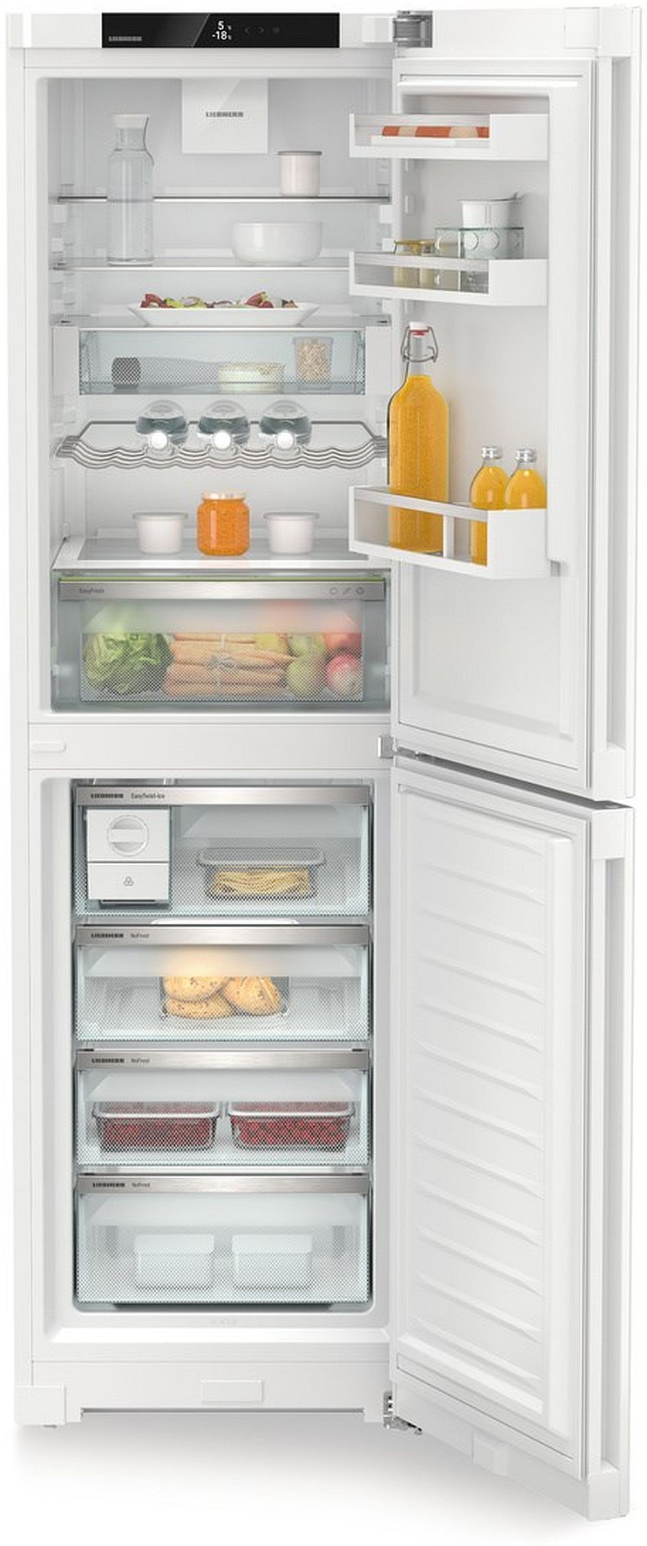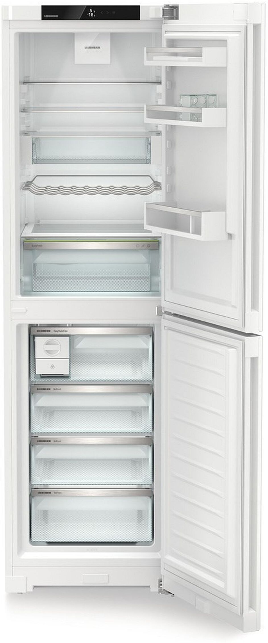 The Liebherr CNC5724 Freestanding Fridge Freezer Frost Free offers a perfect blend of style and functionality. With a generous 227L fridge and 132L freezer capacity, it ensures ample storage. The frost-free technology eliminates manual defrosting, while DuoCooling maintains optimal humidity. Rated C for energy efficiency, it features a digital touch display, height-adjustable shelves, and an ultra-quiet 35dB operation. The CNC5724’s sleek white finish, recessed grip handles, and versatile storage solutions, including a bottle rack and egg tray, make it an excellent addition to any kitchen. Enjoy peace of mind with visual and audible open door alerts.