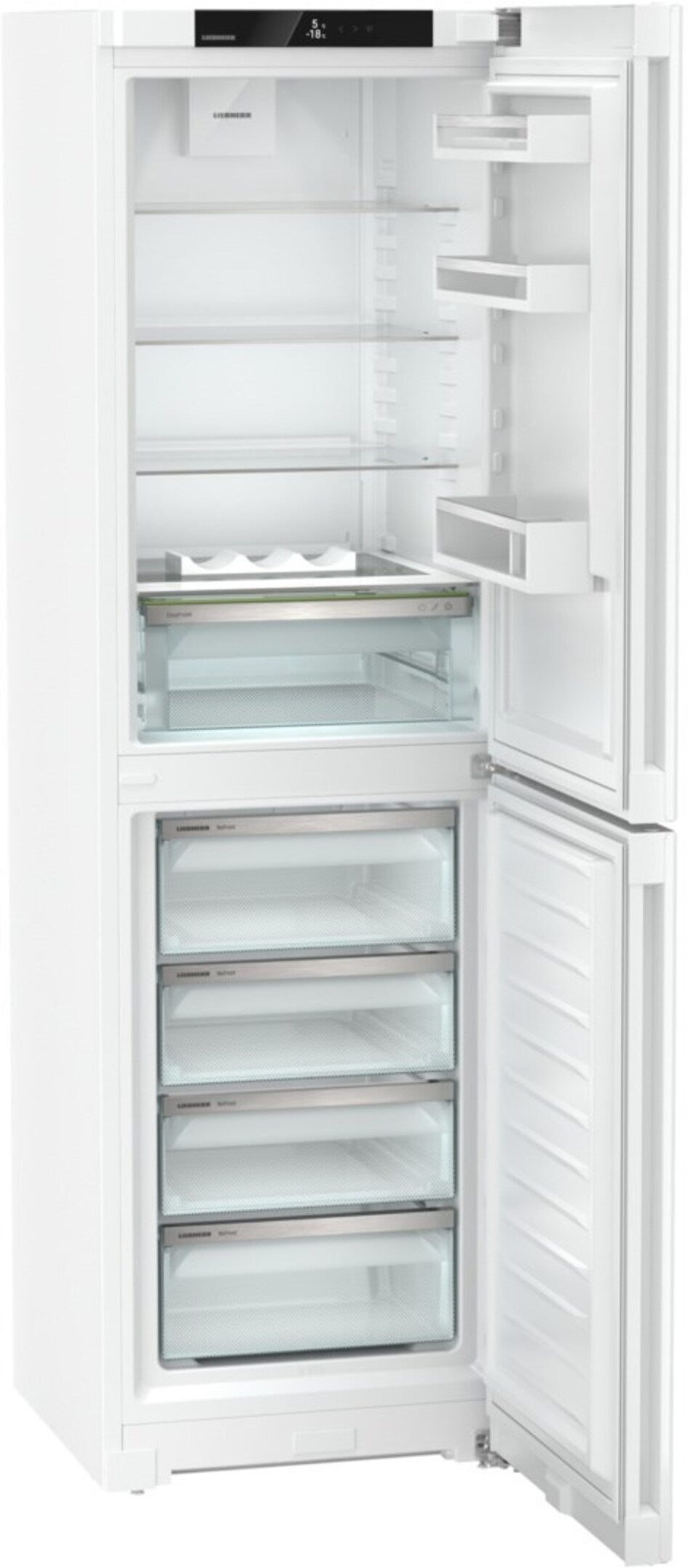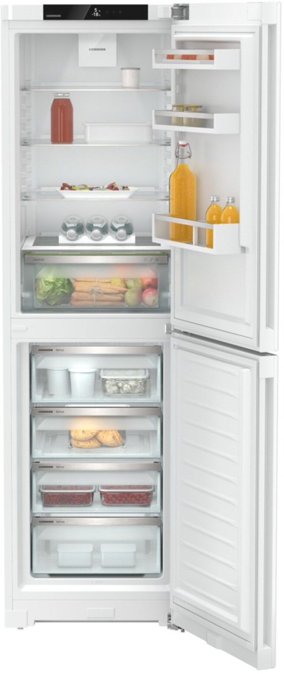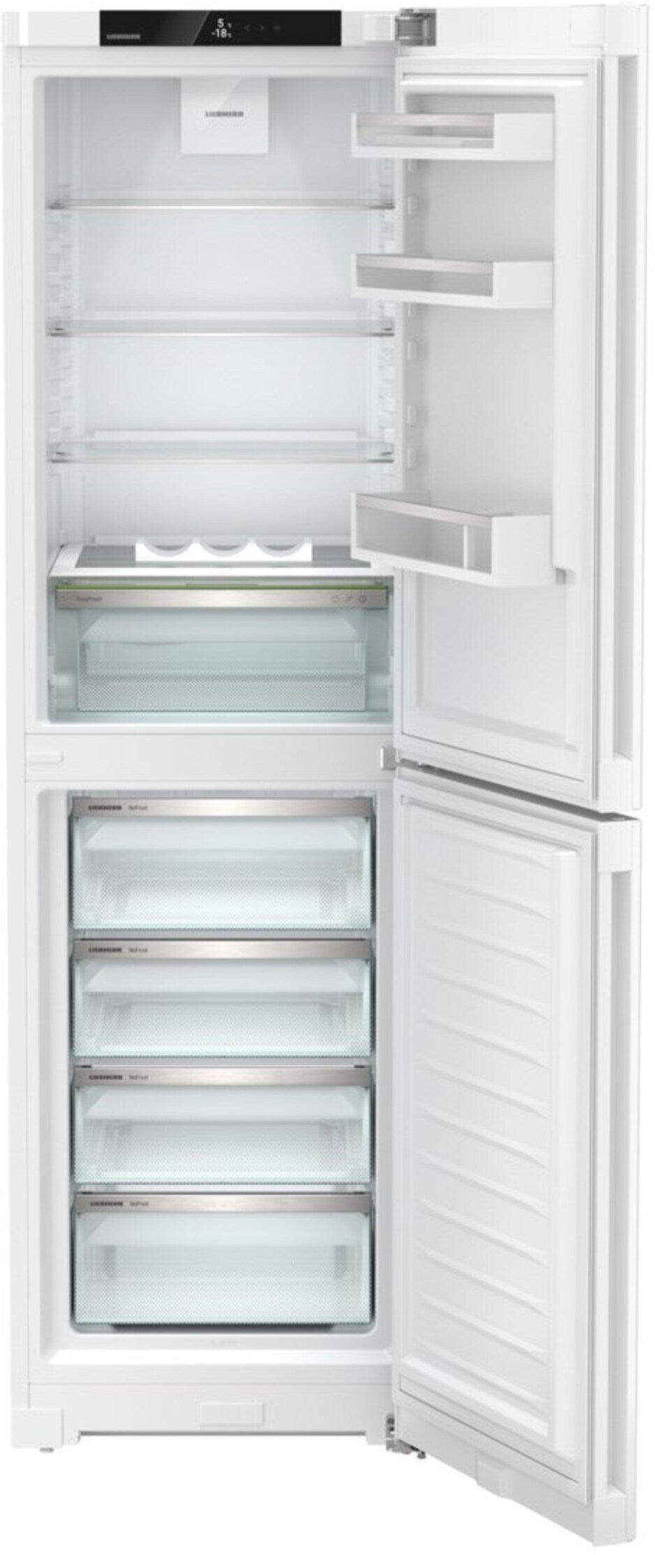 This white Liebherr fridge freezer has a fridge capacity of 227L and a freezer capacity of 132L. The fridge compartment has 3 height adjustable shelves, an egg tray and an EasyFresh Zone. The freezer compartment has 4 drawers, NoFrost cooling technology and VarioSpace. The CND5704 features an open door alarm and a power failure alarm.