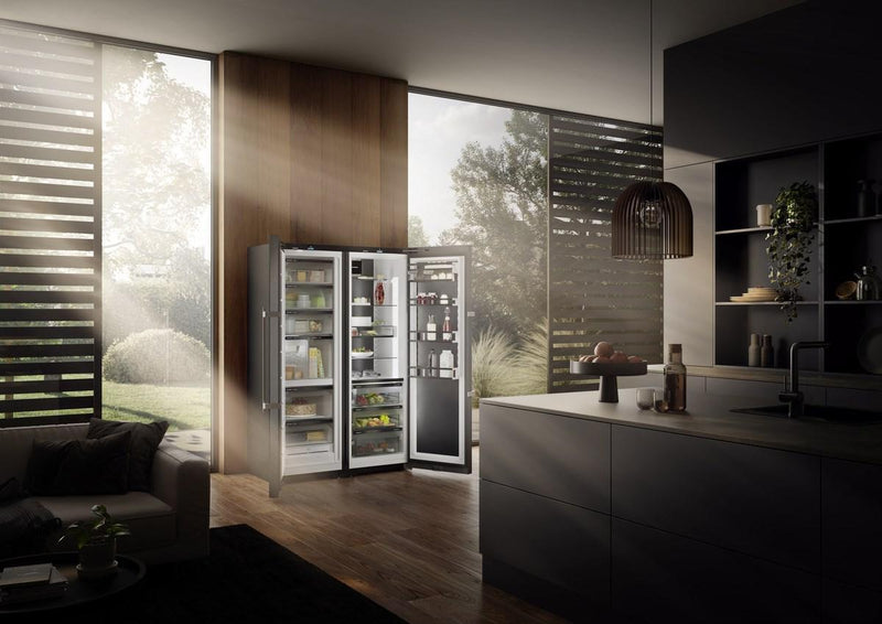 The Liebherr XRFBS5295 stands out as a pinnacle of refrigeration technology, with its sleek freestanding side-by-side design in striking BlackSteel. This model marries the BioFresh Professional system with NoFrost technology, ensuring long-lasting freshness and eliminating the need for manual defrosting. Energy-efficient with classes C and D for the fridge and freezer respectively, it combines low energy consumption with a whisper-quiet operation at just 34 dB. The XRFBS5295 boasts advanced features like a 2.4" TFT colour touch and swipe display, and smart connectivity for effortless control. With three temperature zones, an IceMaker, and automatic SuperCool and SuperFrost functions adjustable via app, it offers unmatched convenience and versatility.