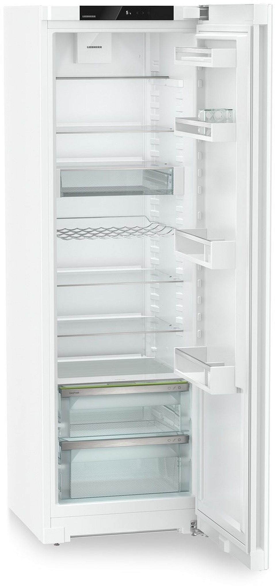 Introducing the Liebherr Plus RD5220, a sleek white freestanding larder fridge designed for efficiency and convenience. This model features an energy-efficient D rating with an annual consumption of only 98 kWh, and a quiet operation at 35 dB. It's equipped with an intuitive monochrome LC touch display for easy control, including functions like SuperCool, which can be adjusted on the appliance or via an app. The fridge boasts a spacious interior with seven adjustable shelves and a universal EasyFresh drawer, ensuring optimal storage conditions. With LED ceiling lighting and modern connectivity options, the RD5220 is the perfect blend of functionality and style for any modern kitchen.