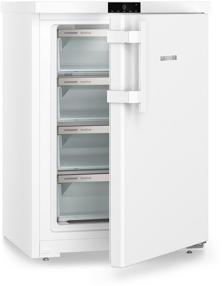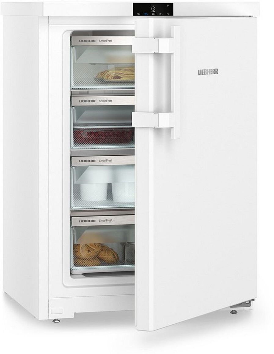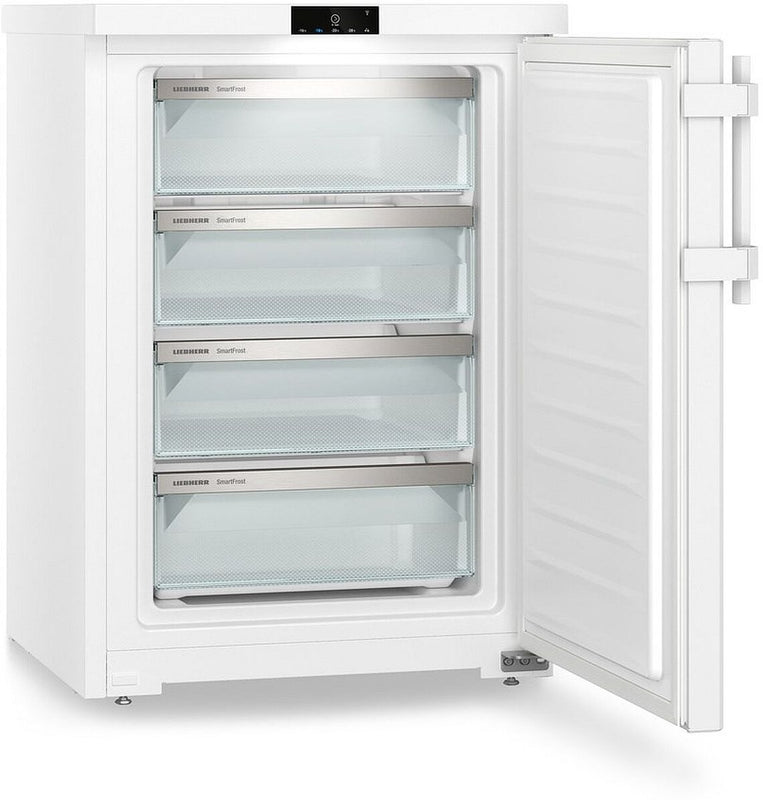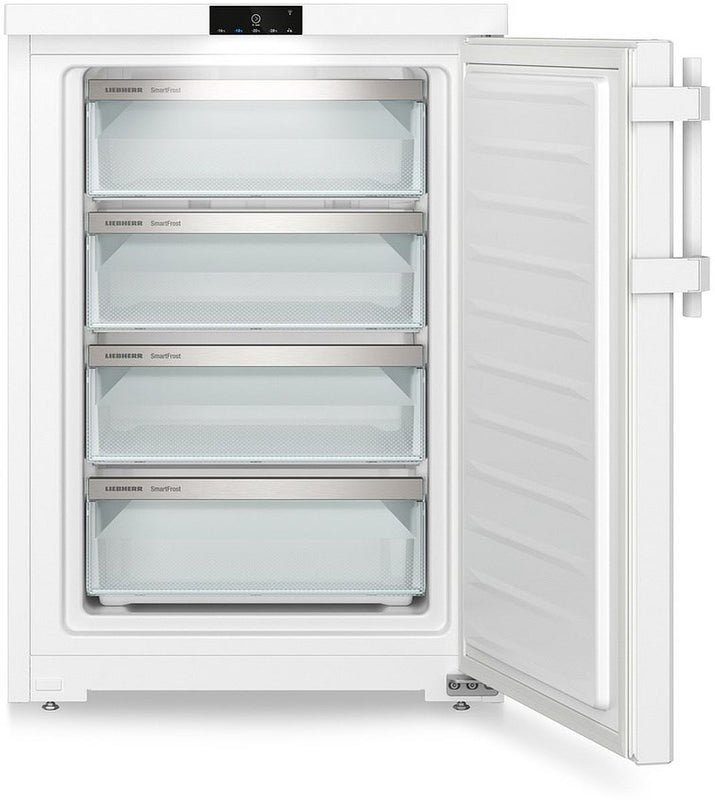 The Liebherr Plus FDI1624 is a compact and efficient freestanding upright freezer, perfect for under-counter installation with its sleek white finish. This model features SmartFrost technology, which reduces ice build-up and simplifies maintenance with manual defrosting. Rated D for energy efficiency, it keeps operational costs low while maintaining a quiet 36 dB noise level. It includes an intuitive touch UI for adjusting SuperFrost settings and monitoring via app, enhancing user convenience. With four FrostSafe drawers and LED lighting, the FDI1624 offers accessible and well-lit storage. Its reversible door and adjustable feet ensure it fits seamlessly into any kitchen layout.