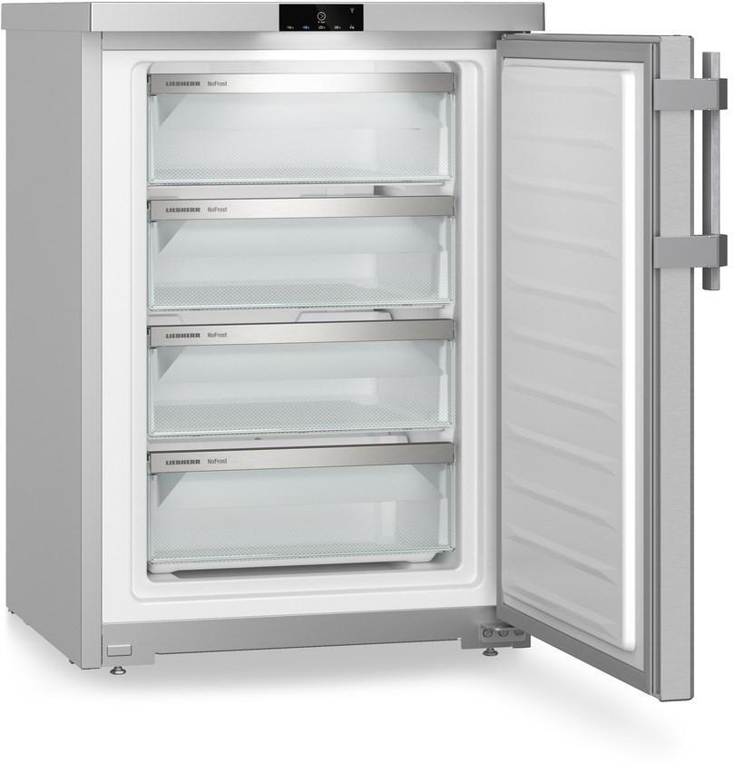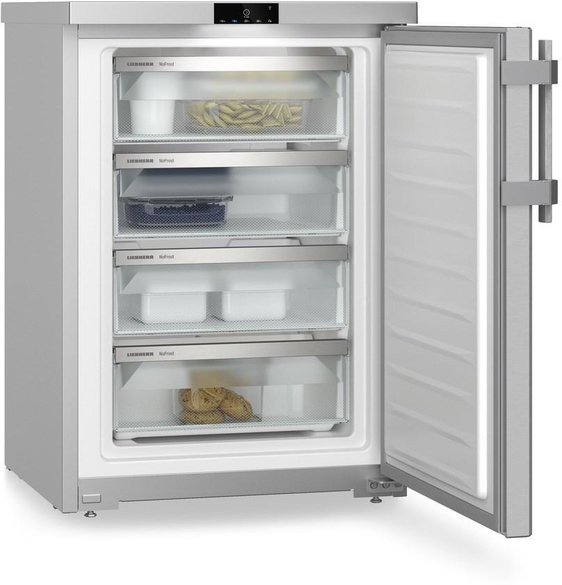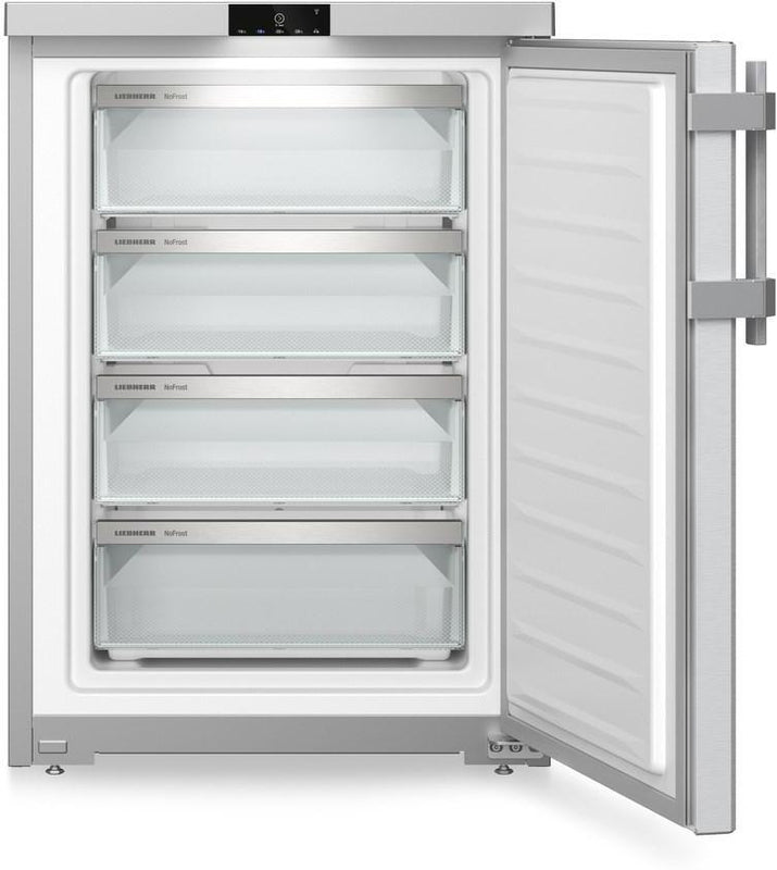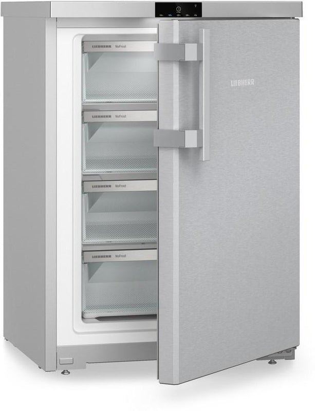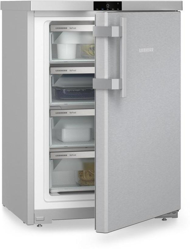 Introduce efficient freezing to your kitchen with the Liebherr Plus FNSDDI1624, a freestanding upright freezer boasting a stylish stainless steel door. This compact model offers NoFrost technology, preventing ice build-up and ensuring hassle-free maintenance with its automatic defrost system. Energy class D efficiency keeps running costs manageable, with a quiet operation at 37 dB. It features a simple touch UI for precise control, including SuperFrost and door alarm functionalities adjustable via an app. The freezer includes four FrostSafe drawers on safety glass for robust storage, LED lighting, and a convenient ice cube tray.