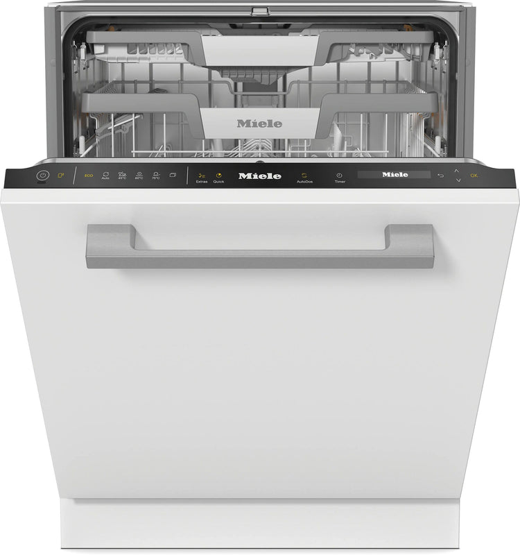 The Miele G7650SCVI Fully Integrated 60cm Dishwasher offers exceptional cleaning efficiency with its A energy rating and 14 place settings. Its 3D MultiFlex tray provides versatile cutlery storage, while BrilliantGlassCare ensures delicate glassware is protected. With 10 wash programmes, including QuickPowerWash and ExtraQuiet, it caters to various needs. The AutoDos system and PowerDisk simplify detergent dosing, and the Auto Open door enhances drying performance. Internet-connected via Miele@home, this dishwasher ensures seamless control. Its EcoPower technology and water consumption of just 8.4 litres per cycle make it eco-friendly and cost-effective.
