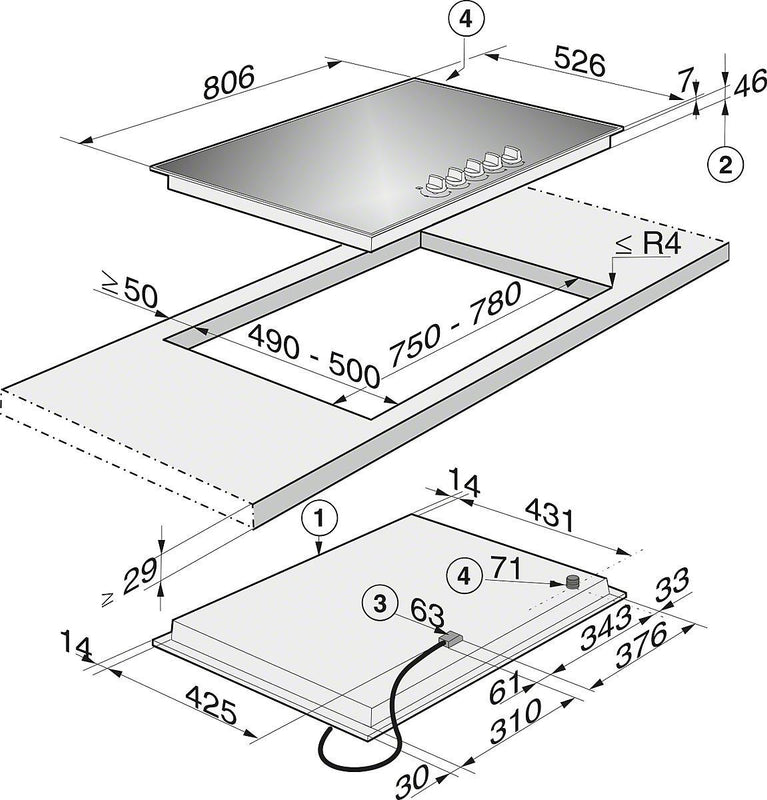 - Cutout Width with Surface-Mounted Installation: 780 Mm