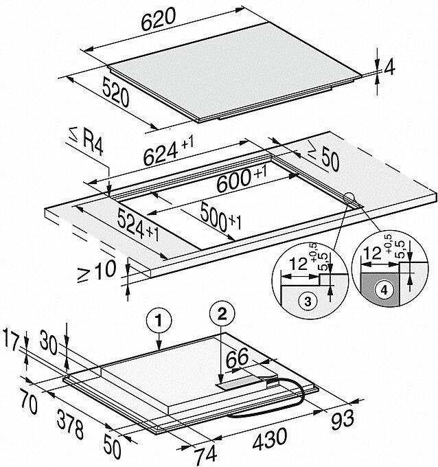 - Cutout Dimensions in mm (width) with Surface-mounted Installation: 600