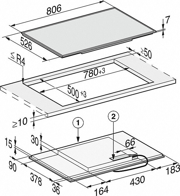 - Cutout Dimensions in mm (width) with Surface-mounted Installation: 780