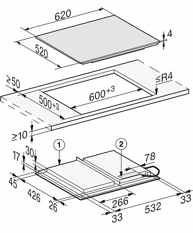 - Cutout Dimensions in mm (width) with Surface-mounted Installation: 600