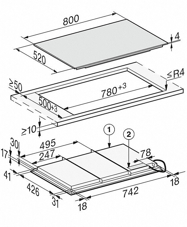 - Cutout Dimensions in mm (width) with Surface-mounted Installation: 780