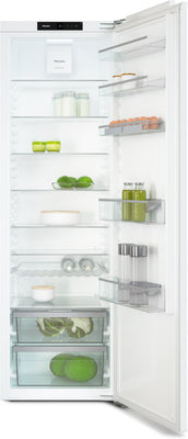 The Miele K7715E fully integrated larder fridge offers a spacious 309-litre capacity and advanced features for optimal food preservation. Its auto defrost function, adjustable glass shelves, and DailyFresh humidity control ensure convenience and freshness. The fridge is energy efficient (rated E), with a quiet operation at 33 dB. Equipped with SensorTouch controls, LED lighting, and Miele@home connectivity, it provides modern usability. Safety features include flame retardant backing, door alarms, and a control panel lock. Perfectly designed for built-in installation, the K7715E also boasts reversible doors, making it versatile for any kitchen layout.