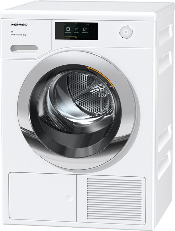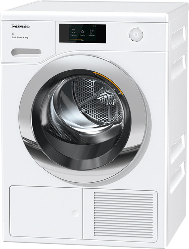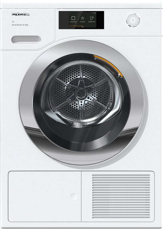 Miele T1 Chrome 9kg Freestanding Heat Pump Condenser Tumble Dryer – White Straight Facia Panel