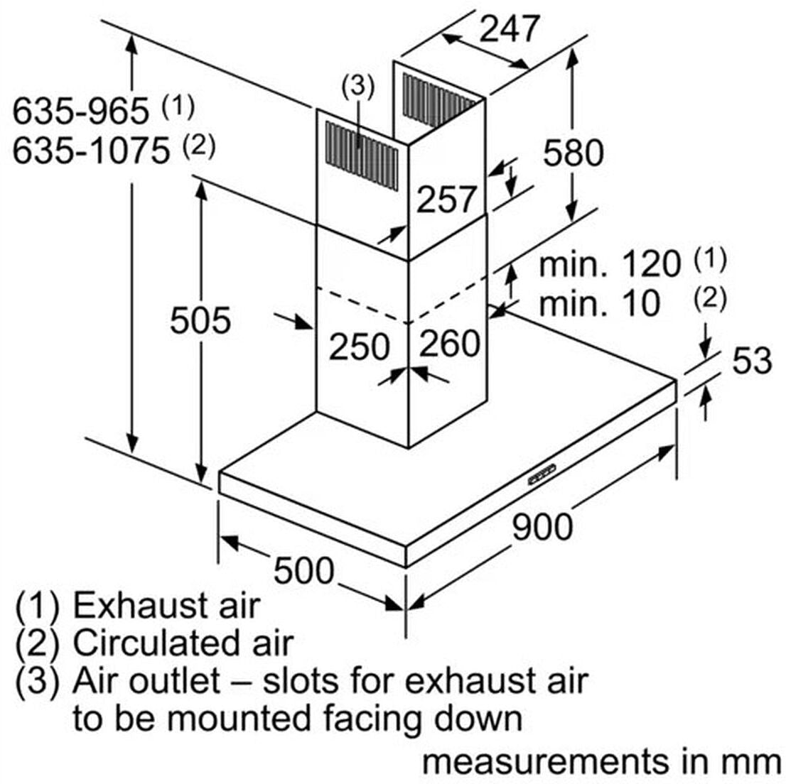 Equipped with an internal motor, the Neff N50 provides efficient air extraction to keep your kitchen environment fresh and odour-free. It features three speeds and a booster power level, allowing you to adjust the ventilation intensity according to your cooking needs. The maximum extraction rate during normal use is 372 m³/h, which increases to an impressive 604 m³/h when using the booster function. This high extraction rate ensures effective removal of cooking smells, steam, and grease from the air.