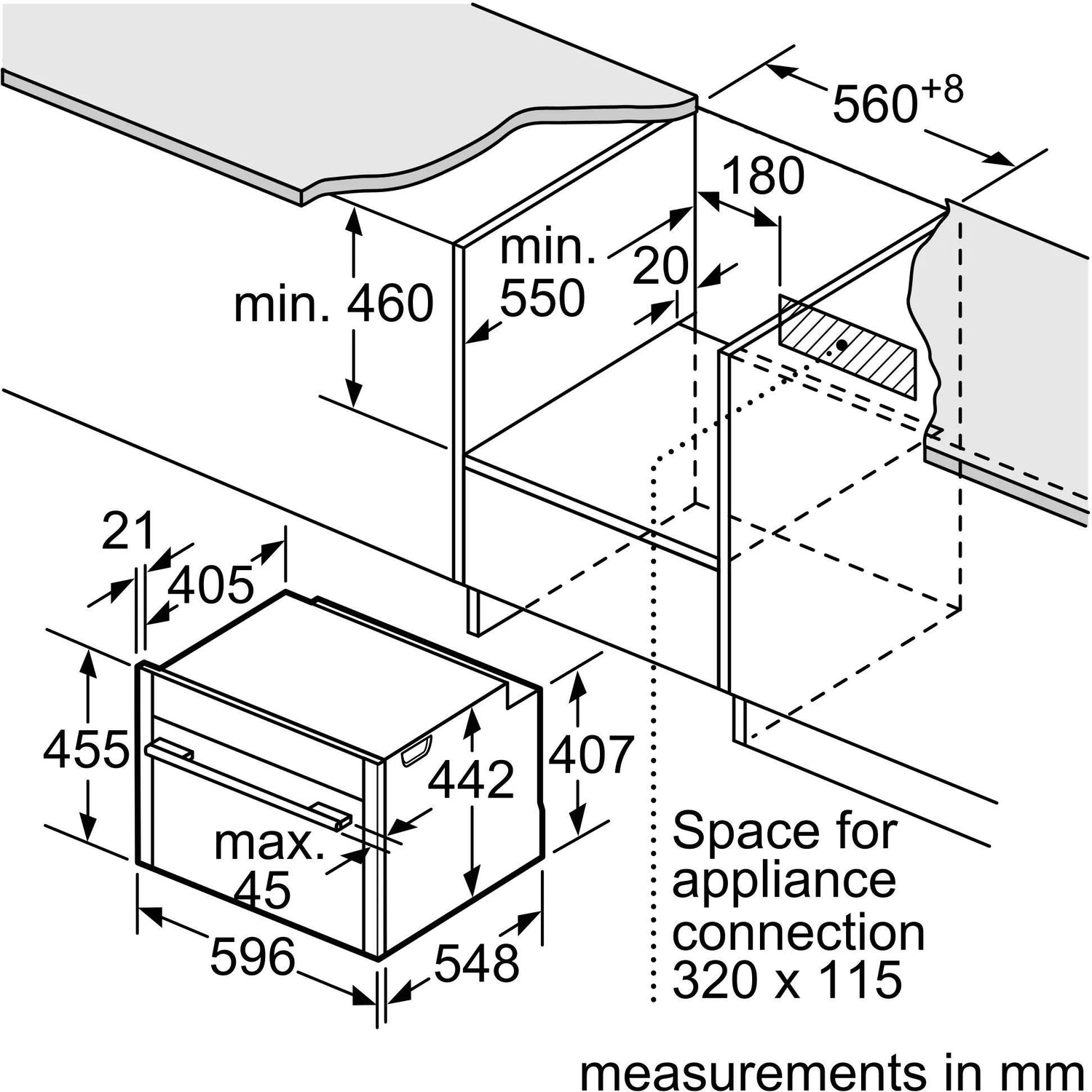 - Niche dimension (hxwxd): 450 mm - 455 mm x 560 mm - 568 mm x 550 mm