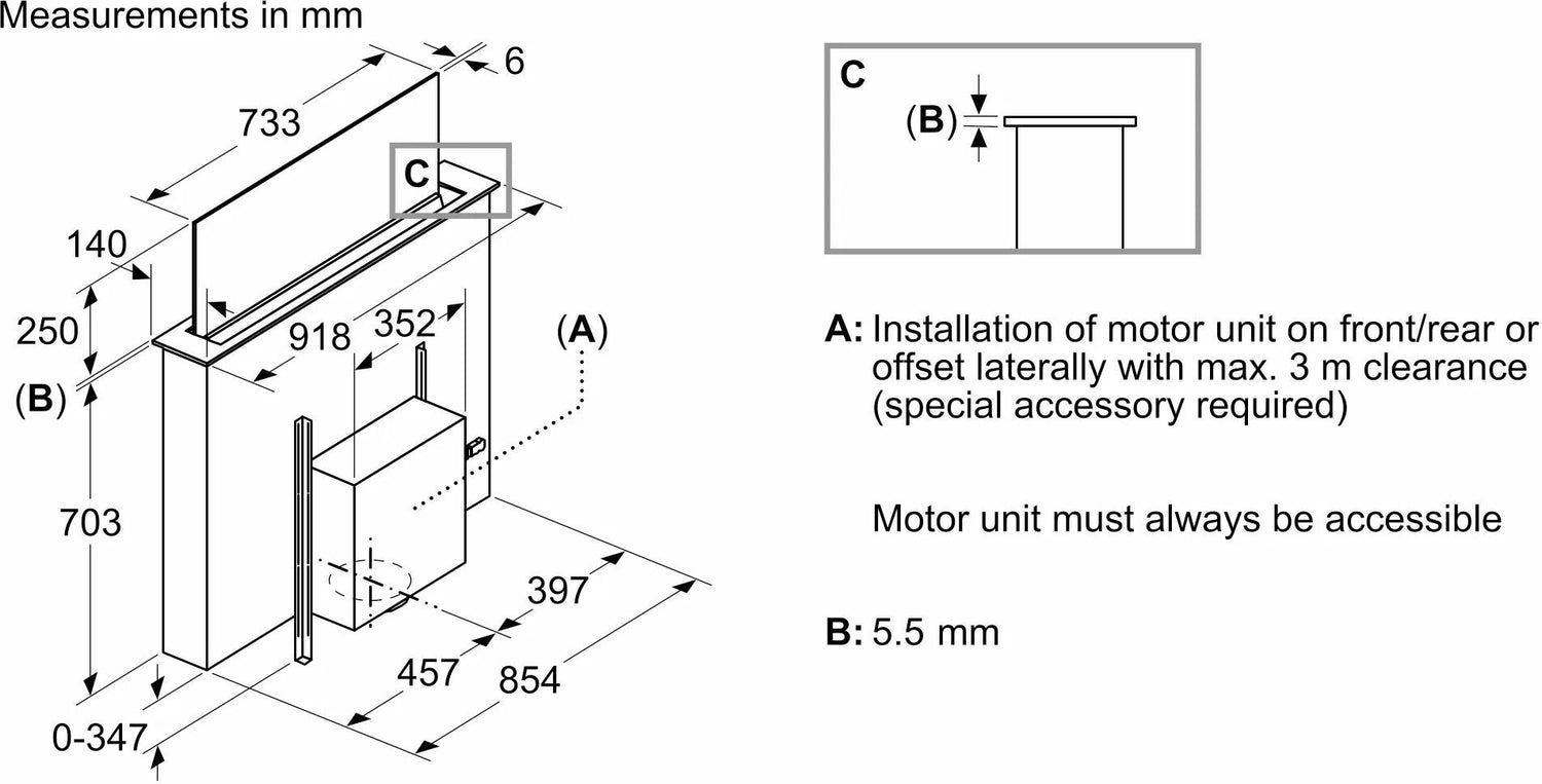 Discover the Neff I98WMM1S7B N90 90cm Down Draft Extractor, a seamless blend of elegance and efficiency for your kitchen. Boasting a sophisticated black finish with a clear glass panel featuring ambient lighting, it effortlessly elevates your kitchen's aesthetics. With three speeds and two booster power levels, it efficiently eliminates odours and fumes, achieving a maximum extraction rate of 833 M³/H on booster mode. The extractor is internet-connected via Home Connect, offering remote operation and voice control options. Designed for island or semi-island kitchen solutions, it's a versatile and smart addition to any modern kitchen.