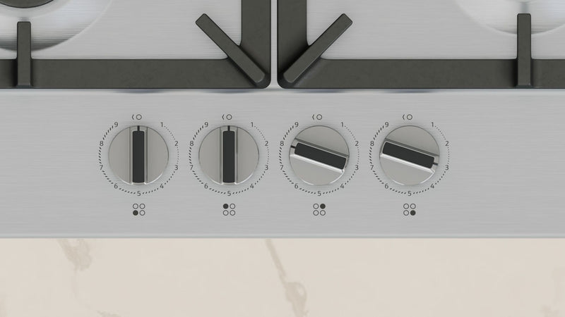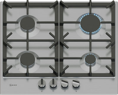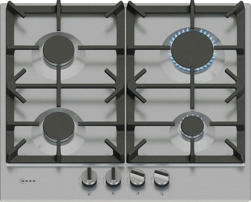 Crafted from stainless steel with a frameless design, the hob fits seamlessly into contemporary kitchens, while the black cast iron pan supports add a touch of contrast and robustness. These supports are fitted with rubber feet to provide extra stability and reduce movement during use. They are also dishwasher safe, making post-cooking clean-up easier and more efficient. The integrated ignition system ensures burners light up quickly and effortlessly with a simple twist of the metallic sword knobs, which are positioned at the front for convenient access and enhanced control. These knobs are designed for comfort and durability, complementing the overall design of the Neff Series 4 range.