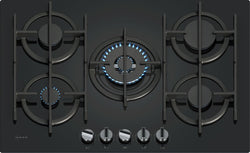 The hob’s surface is made from high-quality stainless steel, which is not only durable but also easy to clean. Black cast iron pan supports provide a stable and robust base for pots and pans, while their rubber feet help reduce movement and protect the surface beneath. The supports are also dishwasher suitable, adding to the appliance’s overall convenience. The frameless design and front-mounted metallic sword knobs give the hob a sleek, contemporary appearance that complements a variety of kitchen styles.