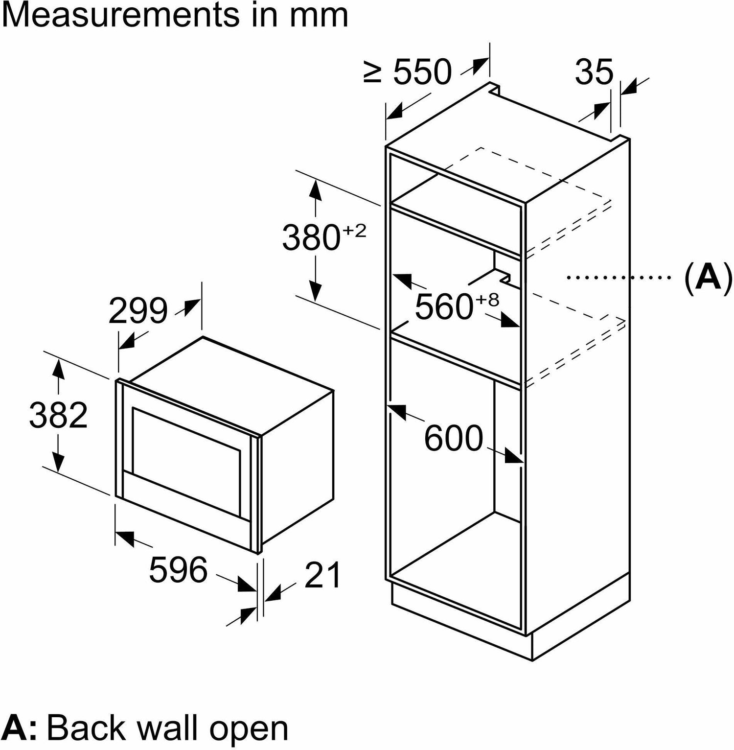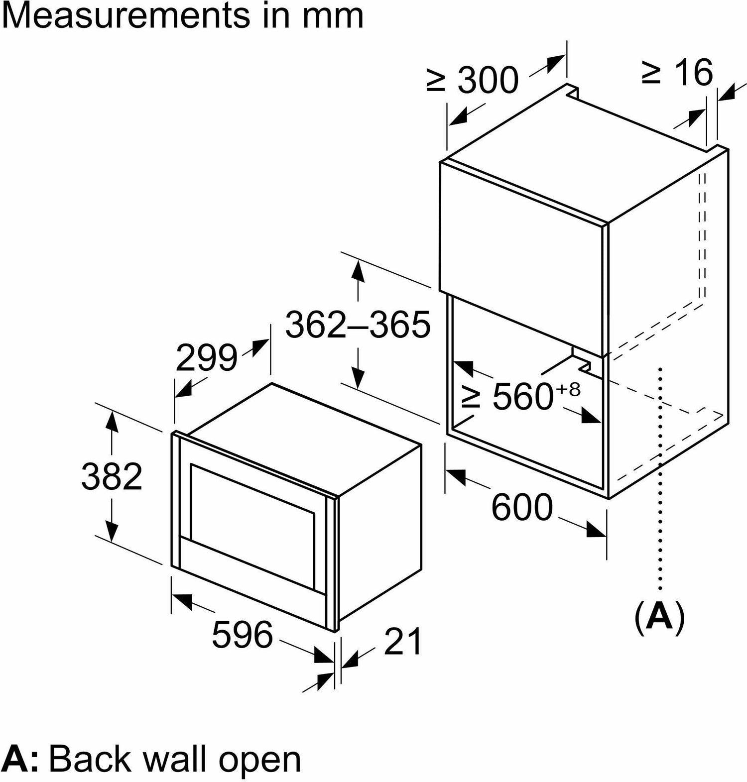 - Niche dimension (hxwxd): 362 mm - 382 mm x 560 mm - 568 mm x 300 mm