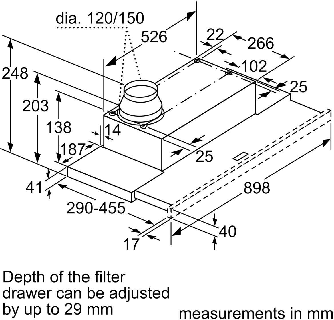 - Duct Size: 150 mm (120 mm Adaptor Supplied)