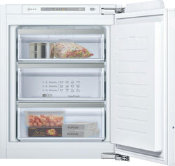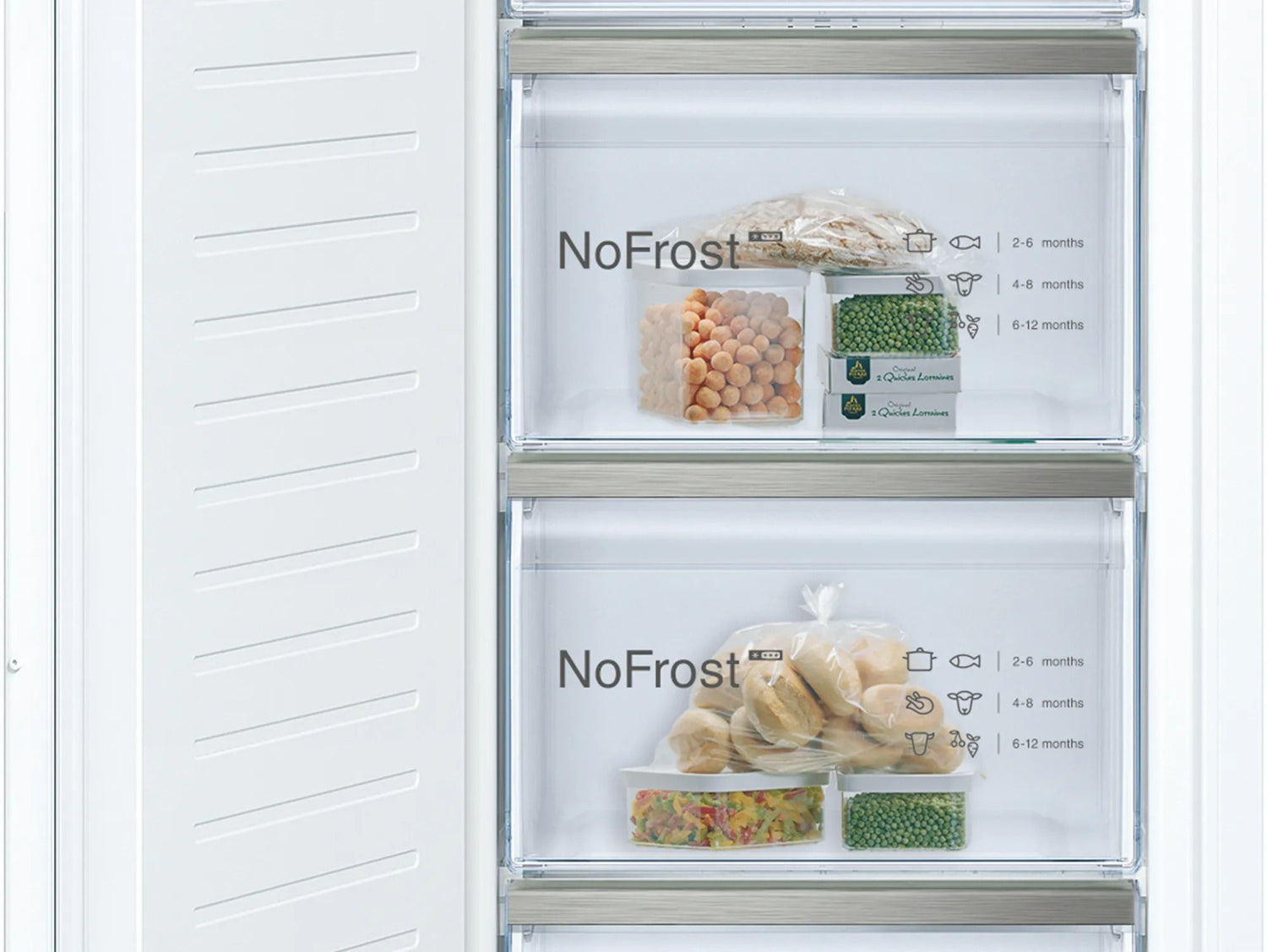 Internally, this Neff N50 freezer offers a well-organised storage space with 5 drawers and 2 shelves, though there are no door bins. The absence of adjustable feet is compensated by the precision of its design, ensuring a snug fit within your kitchen cabinetry.