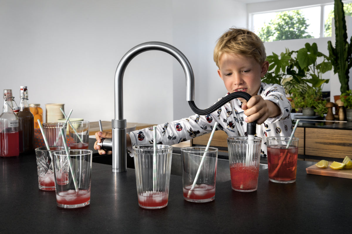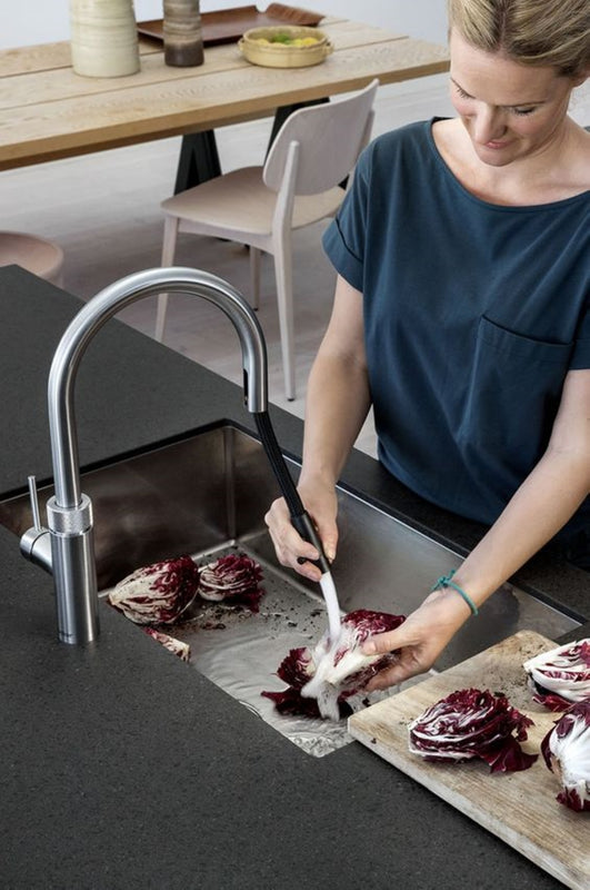 The Quooker FXRSST Flex tap in stainless steel combines convenience and safety, offering hot, cold, and 100°C boiling water instantly. Equipped with a child-proof double push and turn activation, it includes a dual-insulated, cool-to-touch spout and an aerated spray for added safety. The 270° swivel spout with a pull-out hose adds flexibility, while an operation light provides clear status indication. For easy installation, it’s plug-and-play compatible with existing services. Optional CUBE accessory upgrades add chilled, sparkling water functionality, enhancing this all-in-one kitchen essential.