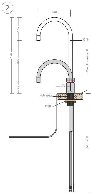 This Quooker tap is designed as a single round boiling water tap, offering simplicity and efficiency without the additional hot and cold mixer functions. Its design features a 360° spout rotation, providing flexibility in use, and the height-adjustable spout makes it adaptable to various kitchen setups and user preferences. The tap is constructed with a stainless steel finish, giving it a clean and modern look that complements a wide range of kitchen styles. The 32mm tap hole diameter ensures compatibility with most standard kitchen installations.