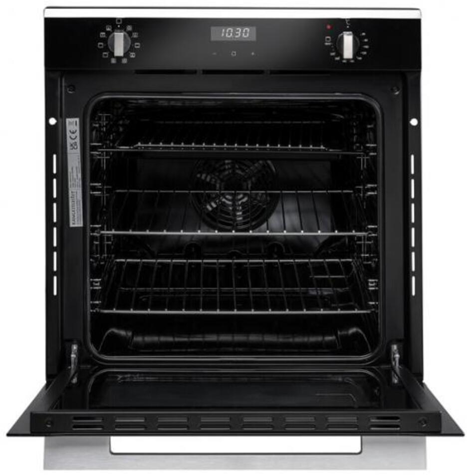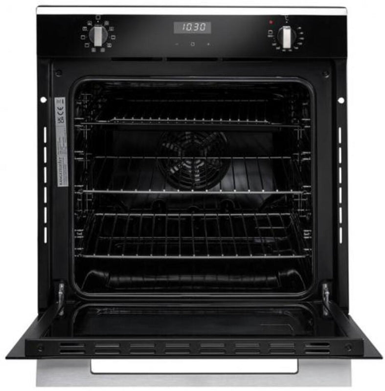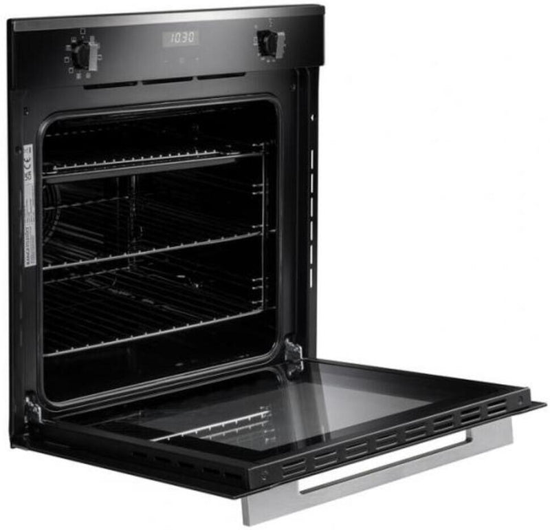 This Rangemaster oven has a capacity of 69L and has a black glass aesthetic, metallic dials and a brushed aluminium handle. This oven has 10 functions including a turbo grill function and a conventional function. The RMB6010BL/SS features an interior oven light, 5 shelf positions and a three button timer.