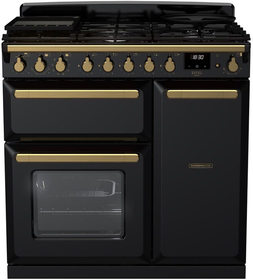 The Rangemaster Estel Deluxe ESDL90DFPGBL-AB1 is not internet-connected, nor does it feature app integration or steam functions, keeping things refreshingly straightforward. What it does offer is rock-solid reliability, robust construction, and everything a home cook or seasoned chef needs for consistent and impressive results. With its well-thought-out layout, rapid heat-up capability, generous oven space and responsive controls, it is perfectly suited to multitasking in busy kitchens. Combining practicality, safety, and high-end styling, this range cooker represents a top-tier choice for anyone seeking premium performance with timeless design. Whether you’re cooking a Sunday roast, prepping for a dinner party, or managing everyday meals, the Estel Deluxe ensures every dish is delivered with precision and ease. Available in a large range of colours with either chrome or antique brass trims.