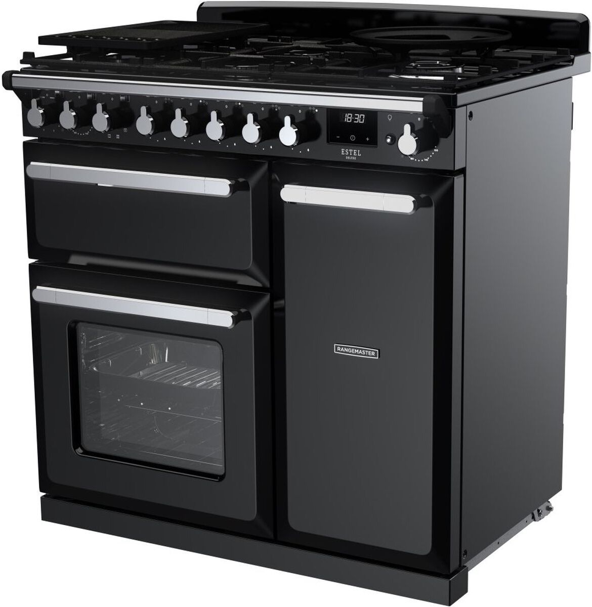 Rangemaster Estel Deluxe 90cm Wide Dual Fuel Range Cooker - Gloss Black / Chrome