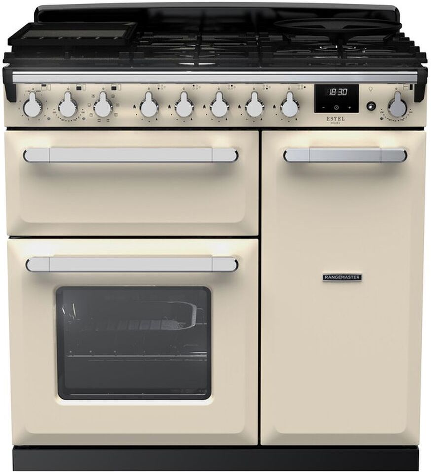 Rangemaster Estel Deluxe 90cm Wide Dual Fuel Range Cooker - Pale Cream / Chrome