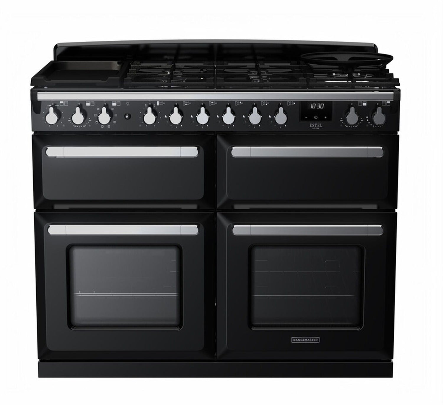 Rangemaster Estel Deluxe BC 110cm Wide Dual Fuel Range Cooker - Gloss Black / Chrome