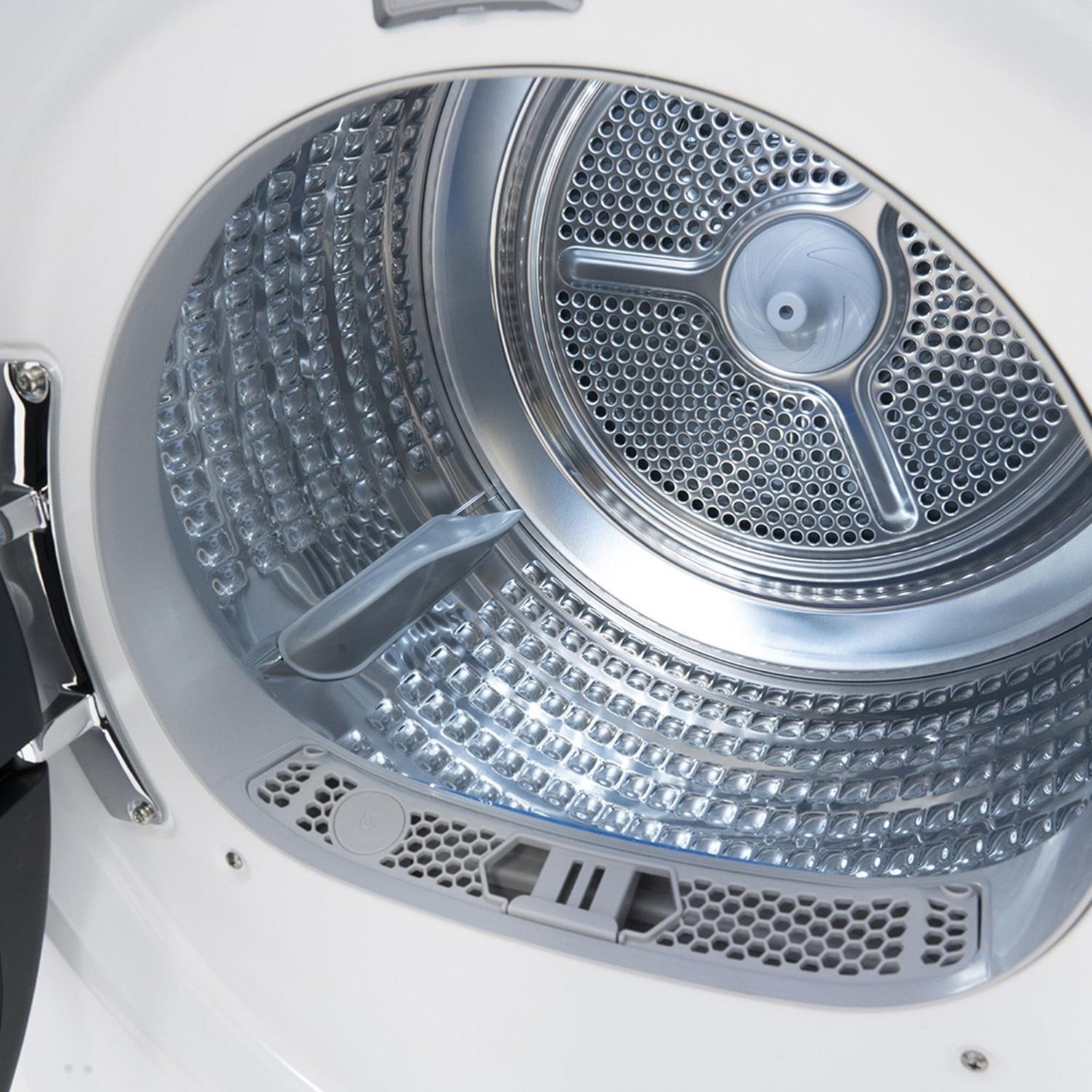 The appliance features intuitive controls via a rotary dial and responsive touch interface, complemented by a clear LED display that provides real-time updates, including a time-left countdown. It also has a time dry option and delay start function, allowing users to plan cycles around their schedules. With practical design touches such as a full glass door with trim, interior drum light, and reversible door for flexible installation, the dryer seamlessly fits into a variety of home environments. Adjustable feet offer stability on uneven surfaces, and the stainless steel drum ensures durability and resistance to wear.