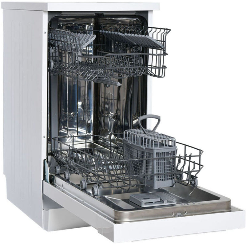 The Sensis DWF0110SLEW 45 cm slimline dishwasher offers efficient cleaning in a compact design, ideal for smaller kitchens. With 10 place settings and adjustable racking, it provides flexibility for varied loads. Five wash programmes, including an eco wash and quick wash, cater to different needs, while the self-cleaning function ensures hassle-free maintenance. The push-button controls and LED display offer easy operation, and features like a delay timer, half-load function, and super active drying enhance convenience. Operating at a quiet 47 dB, this freestanding dishwasher combines performance with efficiency, using just 11 litres of water per cycle.