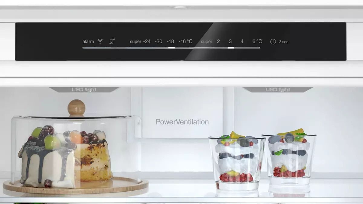 Discover the Siemens KB96NADD0G IQ500 71cm Built-In Frost Free Fridge Freezer - a blend of style and efficiency. With 284L net fridge volume and 98L net freezer volume, its 70/30 split design offers ample storage. Benefit from Auto Defrosting, LED lighting, and humidity control for fresher food. Connect via HomeConnect for remote monitoring. The sleek white finish and touch controls add a modern touch. Super Cool and Super Freeze functions, along with Temperature Warning, ensure food safety. Elevate your kitchen with this smart, energy-efficient appliance.